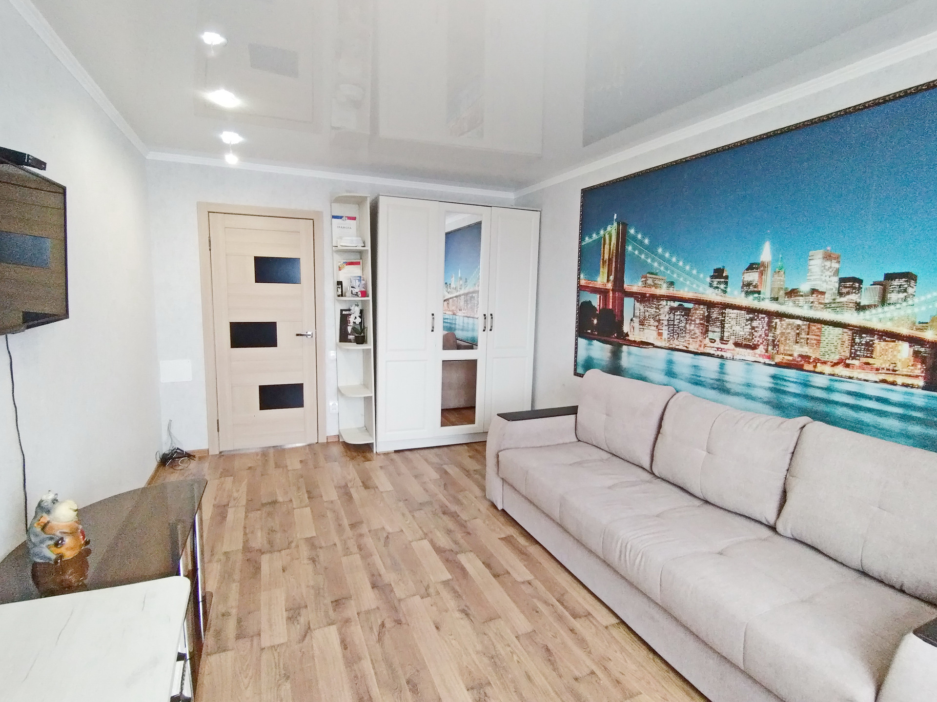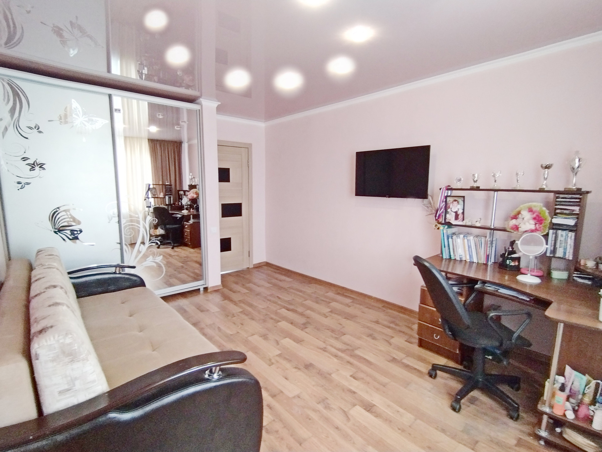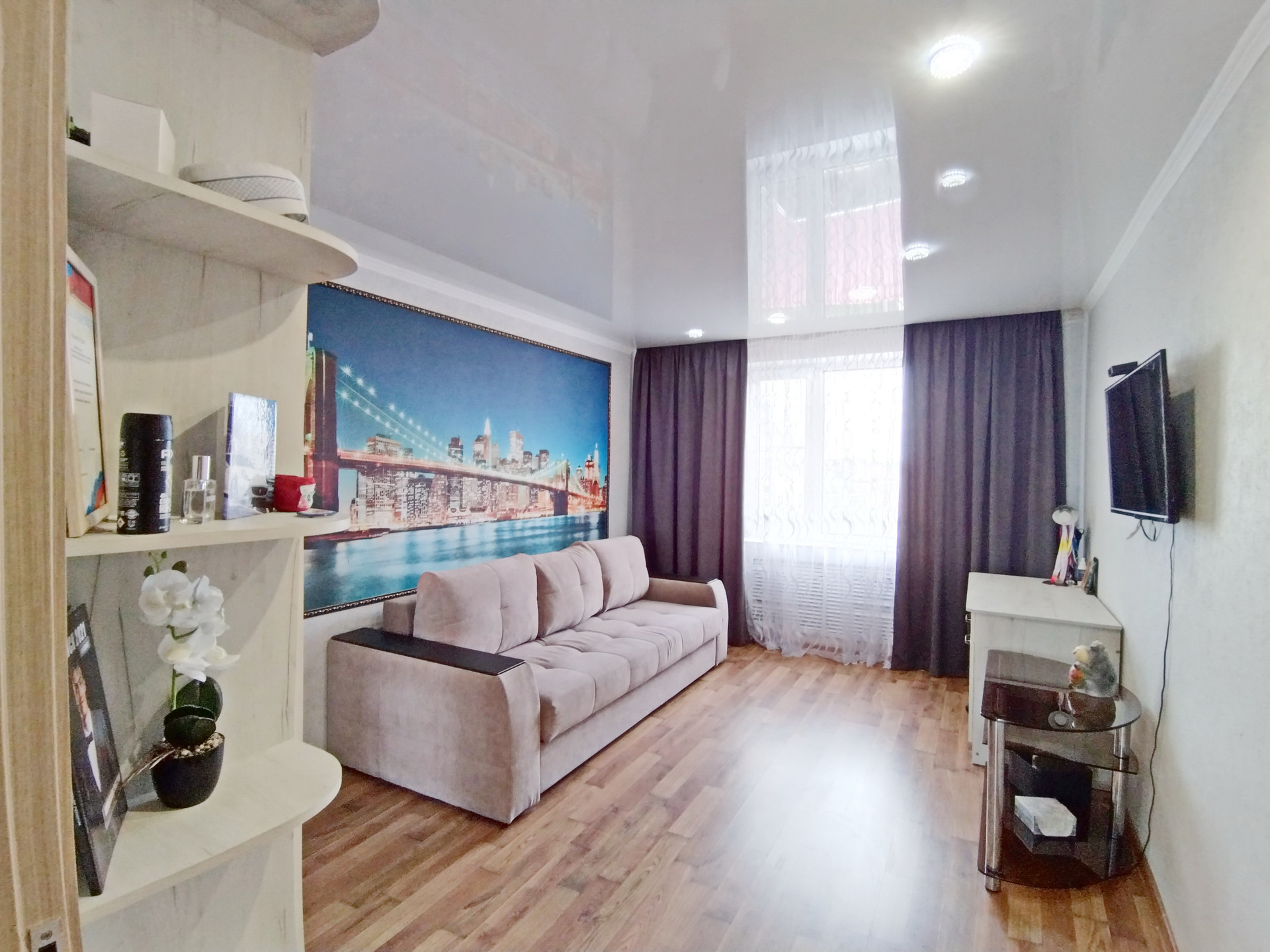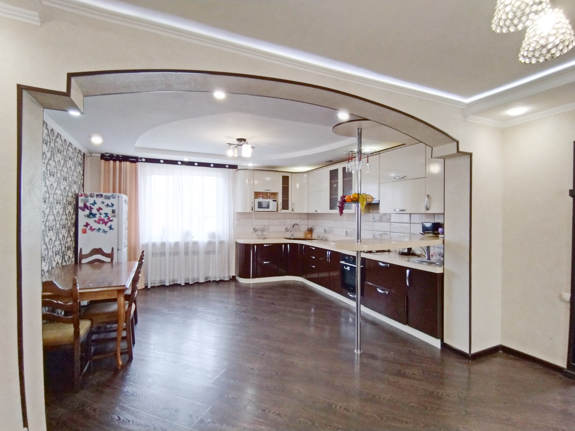 В подарок новым владельцам остается: кухонный гарнитур со встроенной техникой и встроенная корпусная мебель.
