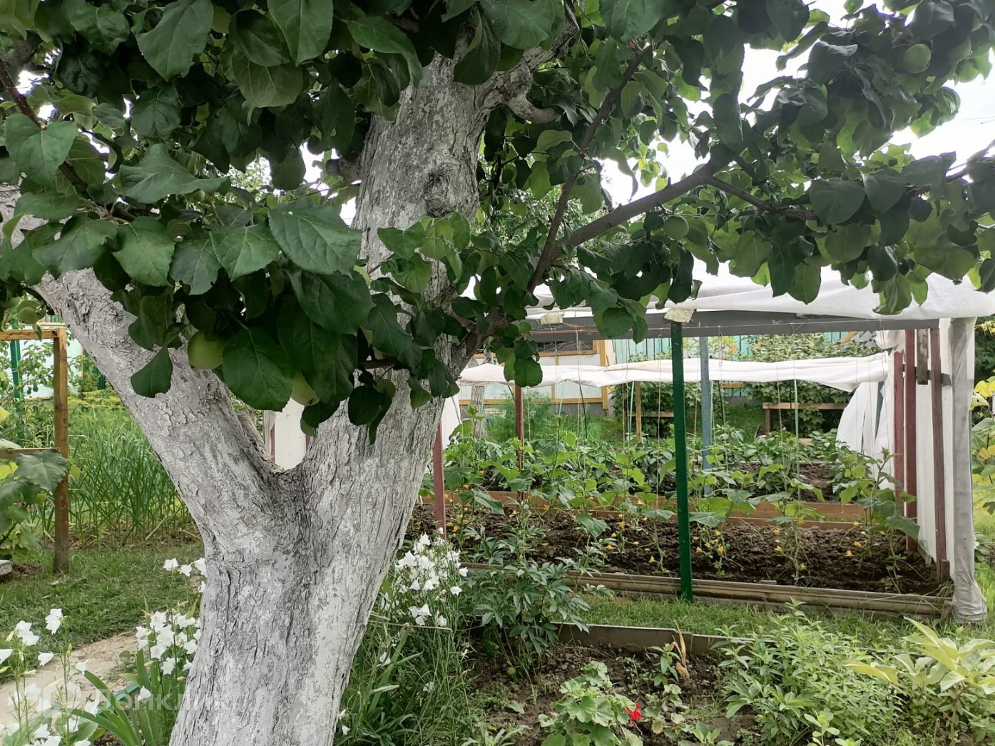 - Есть плодоносные деревья и кустарники, а именно - вкусные яблоки, абрикосы, слива, груши, виктория, смородина, земляника и другие. Для хранения овощей на территории имеется погреб и сарай, есть теплица. Собственная скважина для полива.