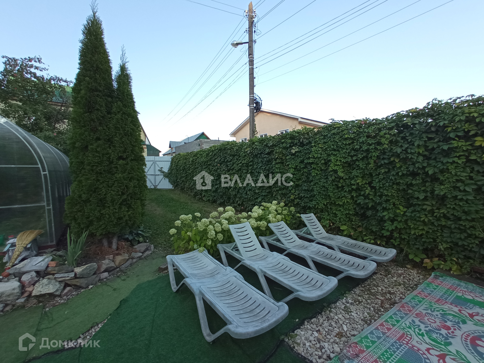 Территория дома огорожена металлическим забором из профлиста, укрыта зеленью, аллея из туй.