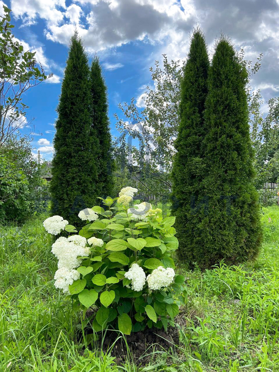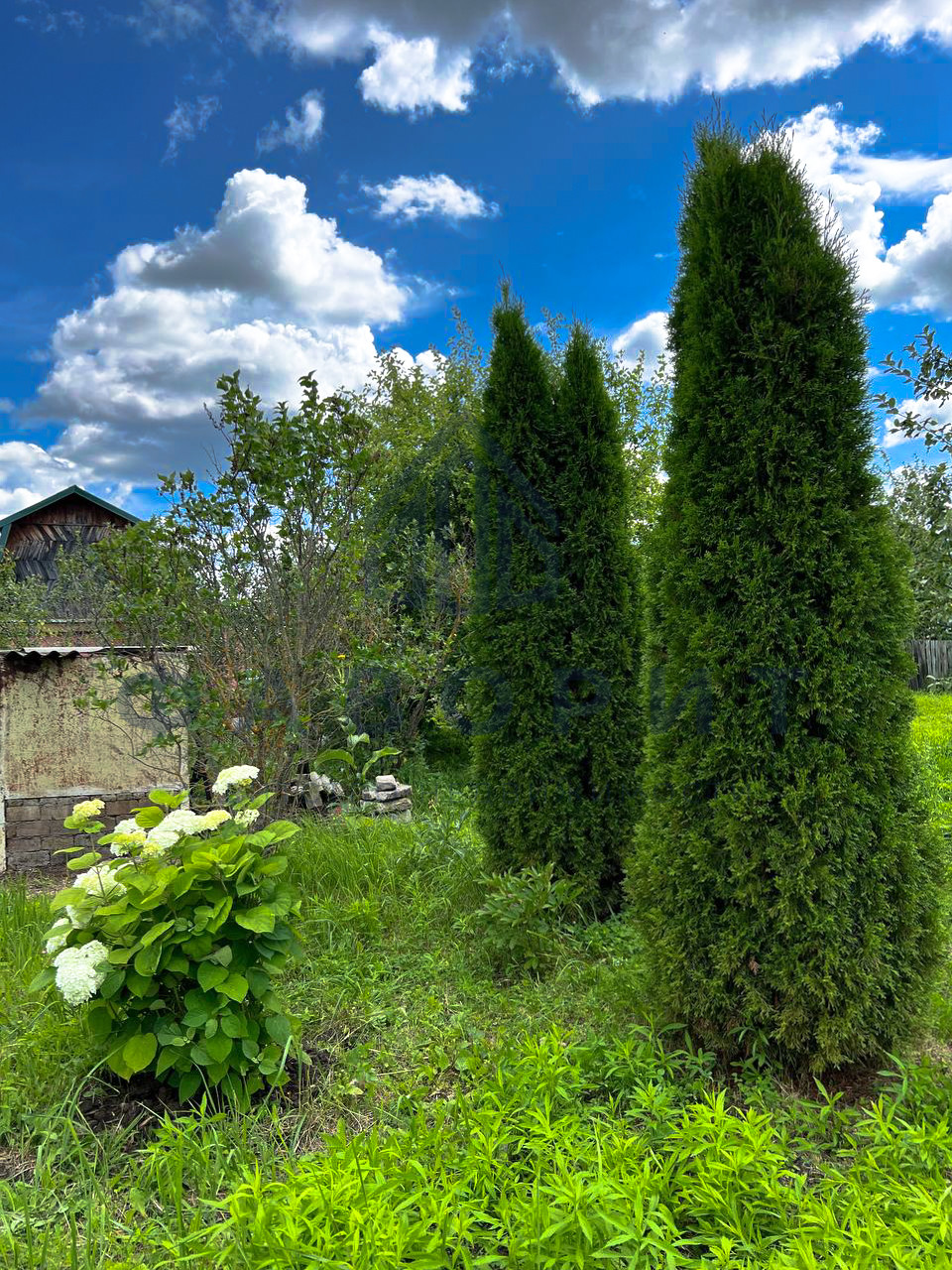 Участок ухожен и засажен. На участке растут туи и плодовые деревья.
