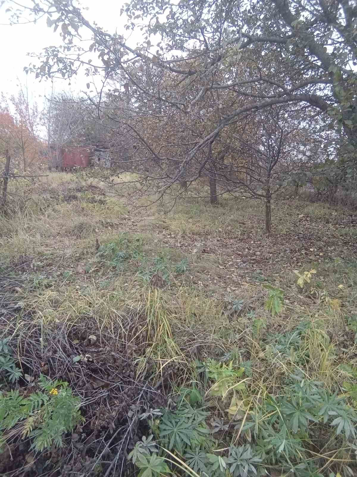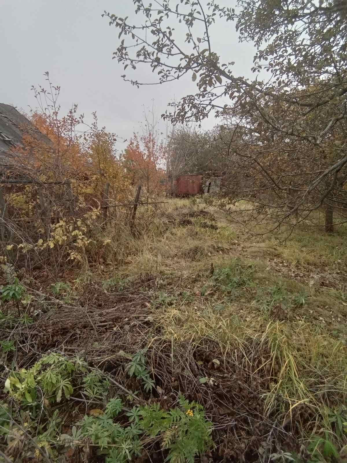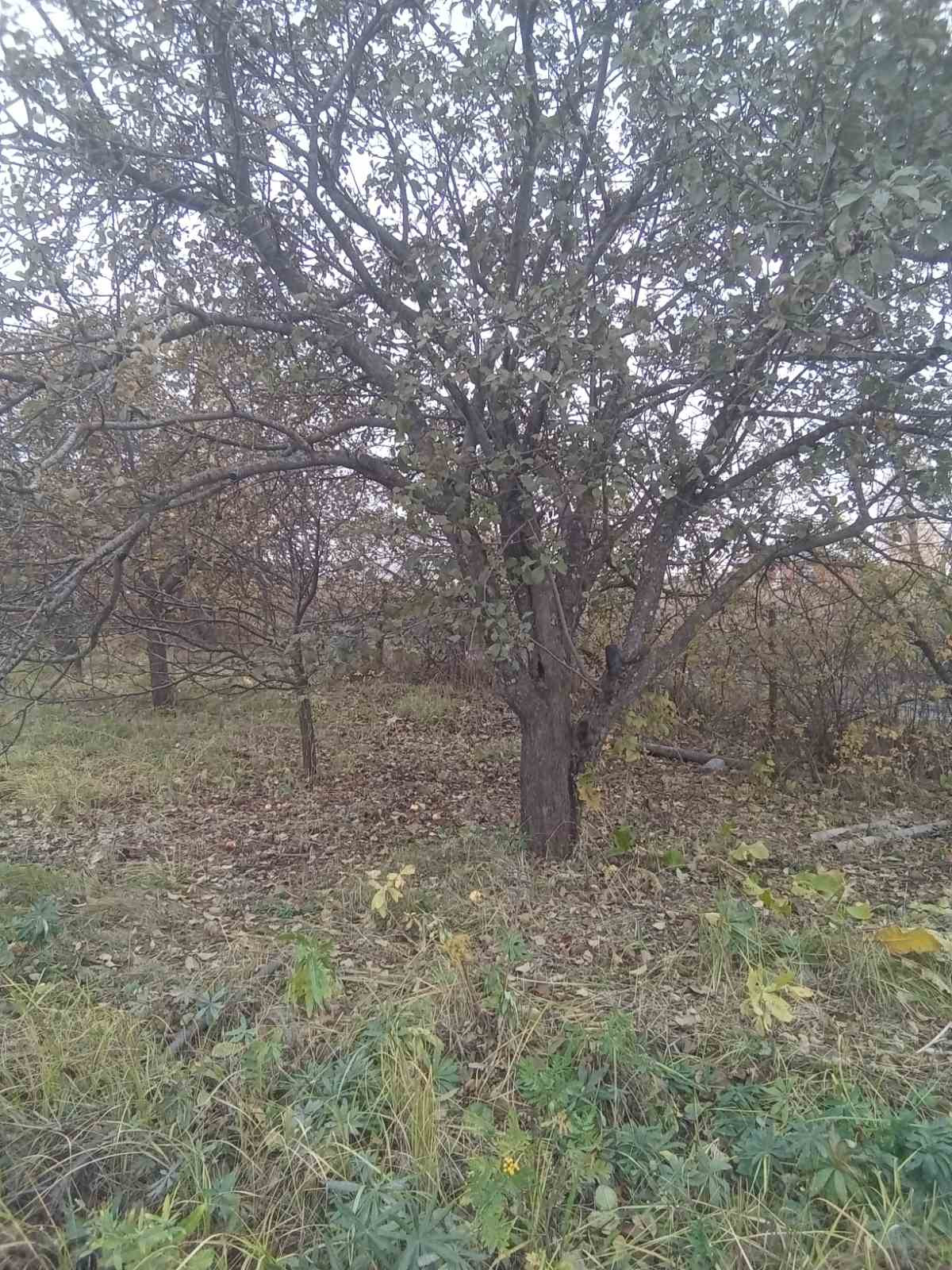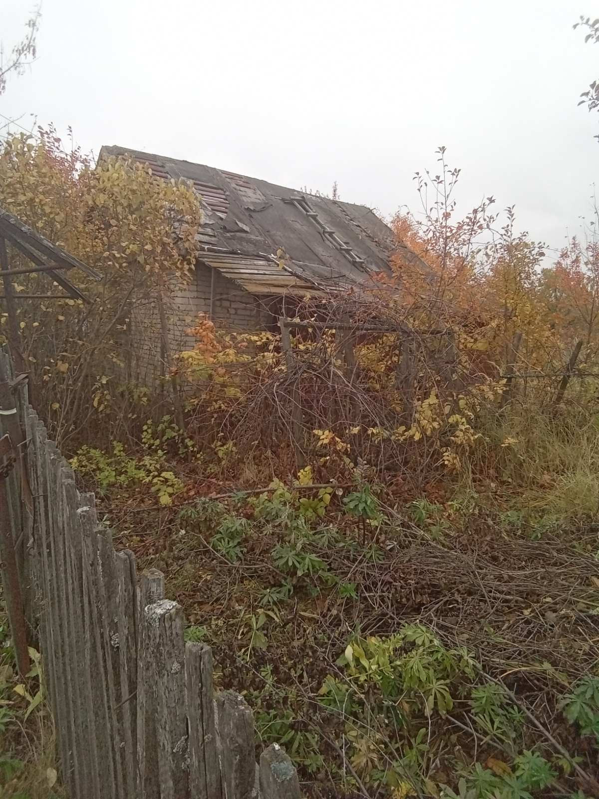 На участке яблони,туалет, кирпичный дом,требующий ремонта.