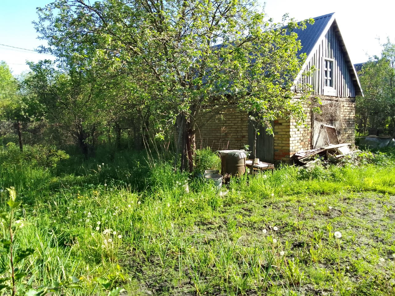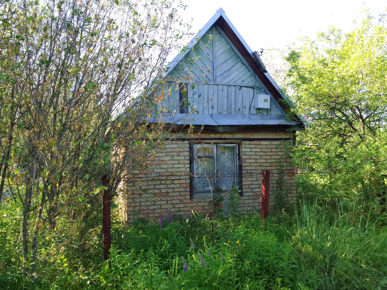 На участке двухкомнатный кирпичный домик 20 м. кв. Электричество заведено в дом. Вода для полива подаётся электронасосом из индивидуального колодца.