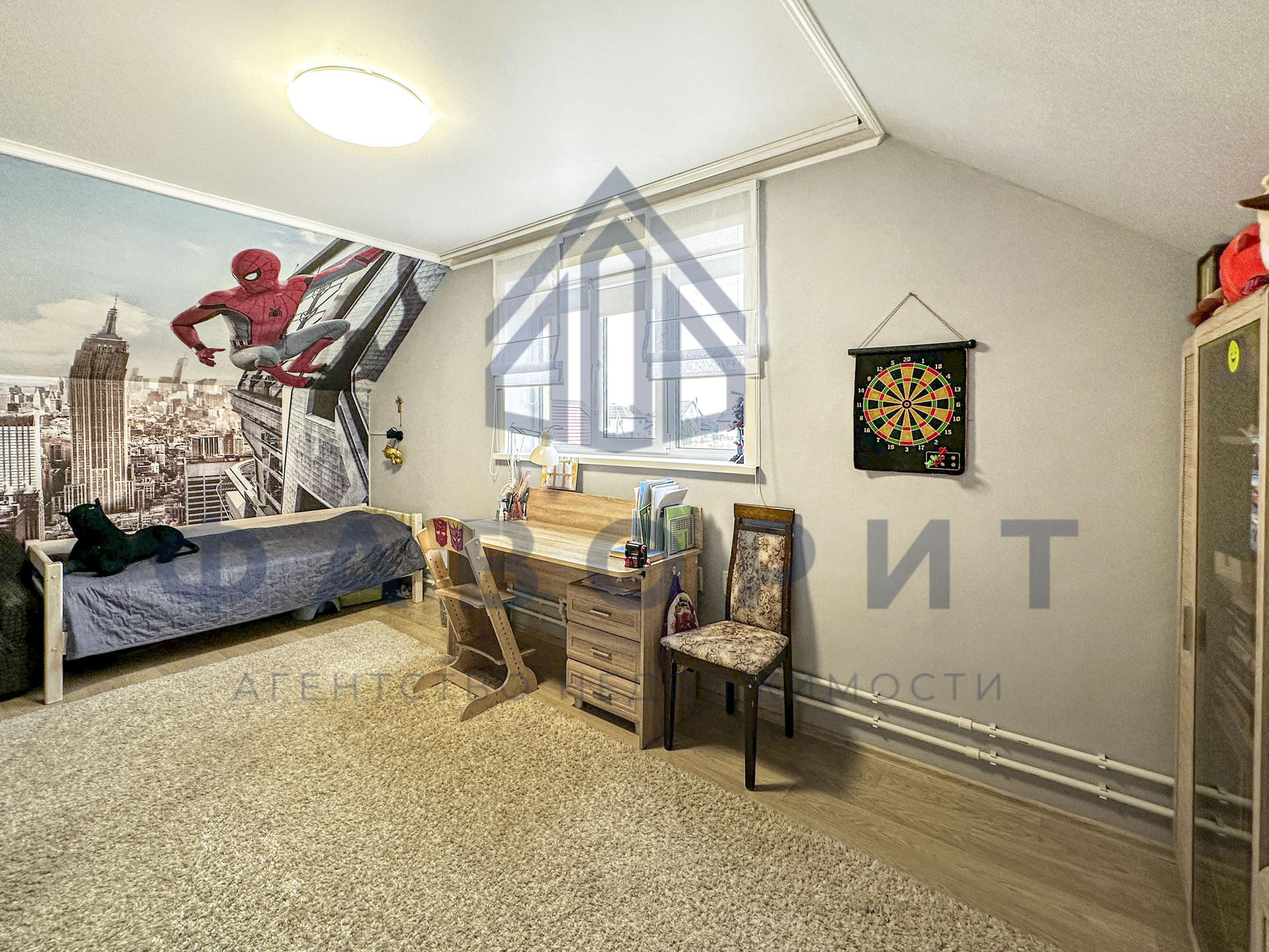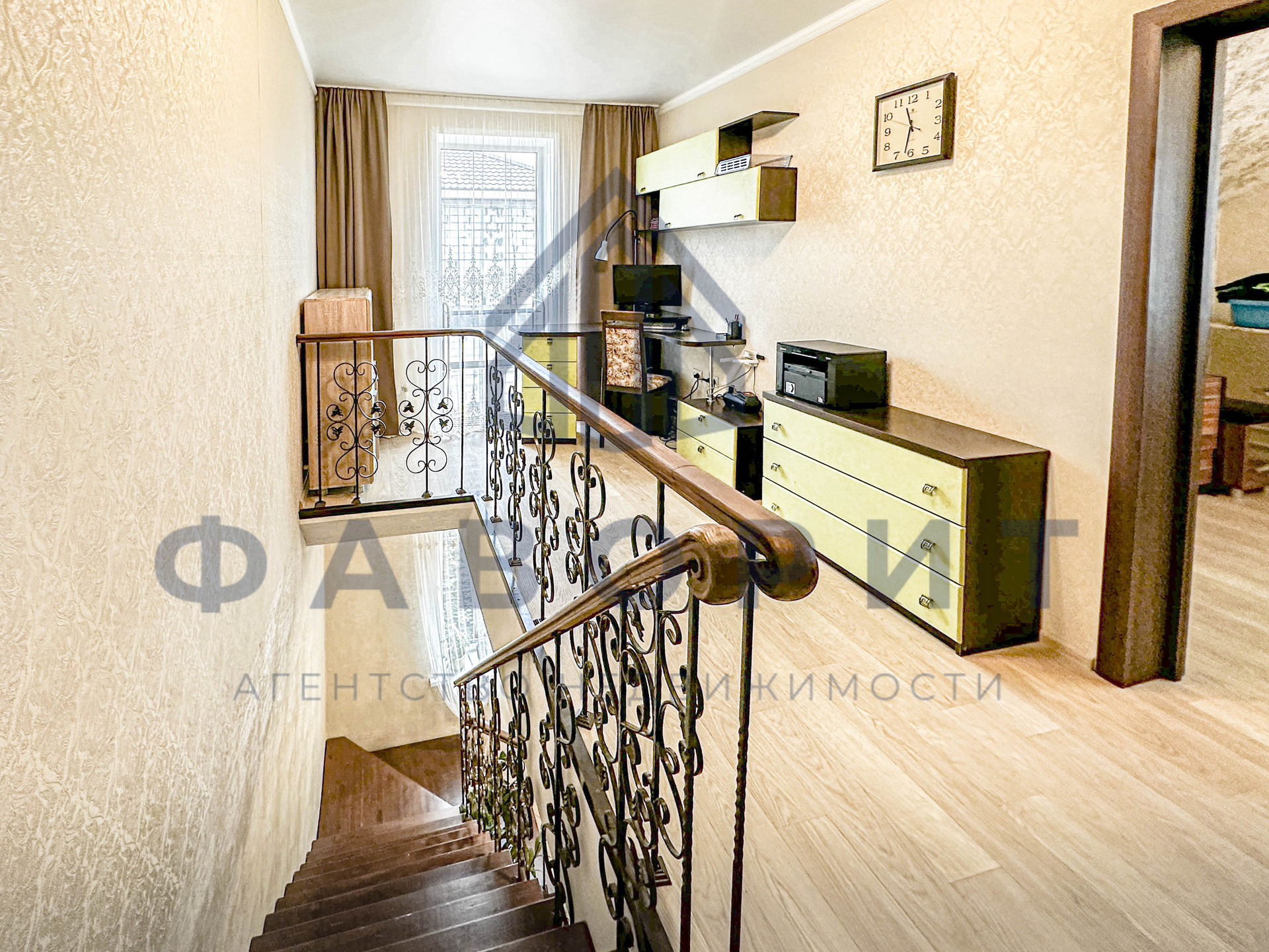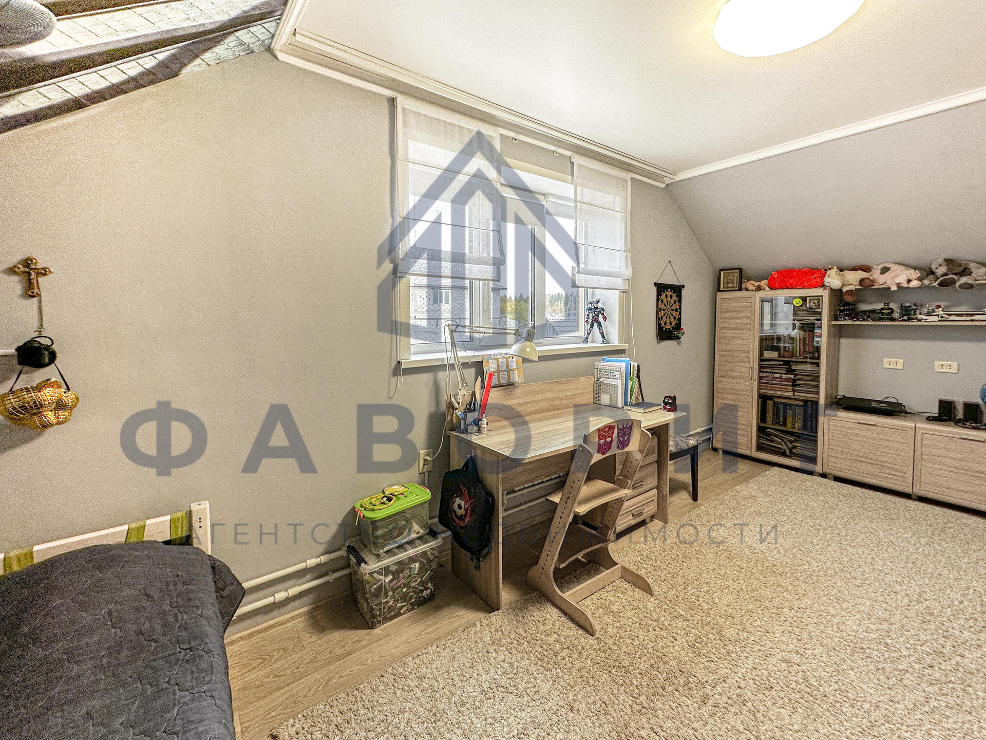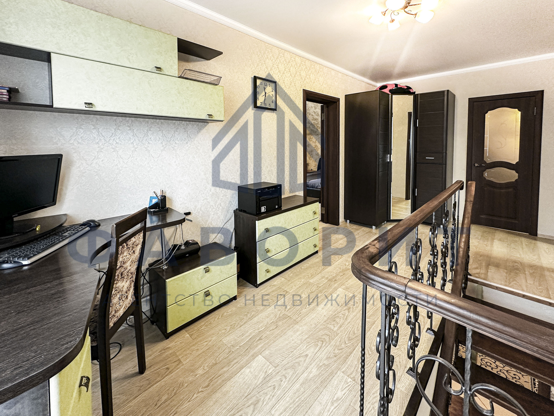 На втором этаже располагаются спальня с двуспальной кроватью и детская/подростковая комната с мебелью для школьника. Между комнатами идеально расположился рабочий кабинет с компьютером. Мечта любой хозяйки — это огромная гардеробная рядом со спальной комнатой. Во всех комнатах сделан хороший ремонт, установлены пластиковые окна, на полу уложен линолеум. Так же в подарок останется вся мебель.