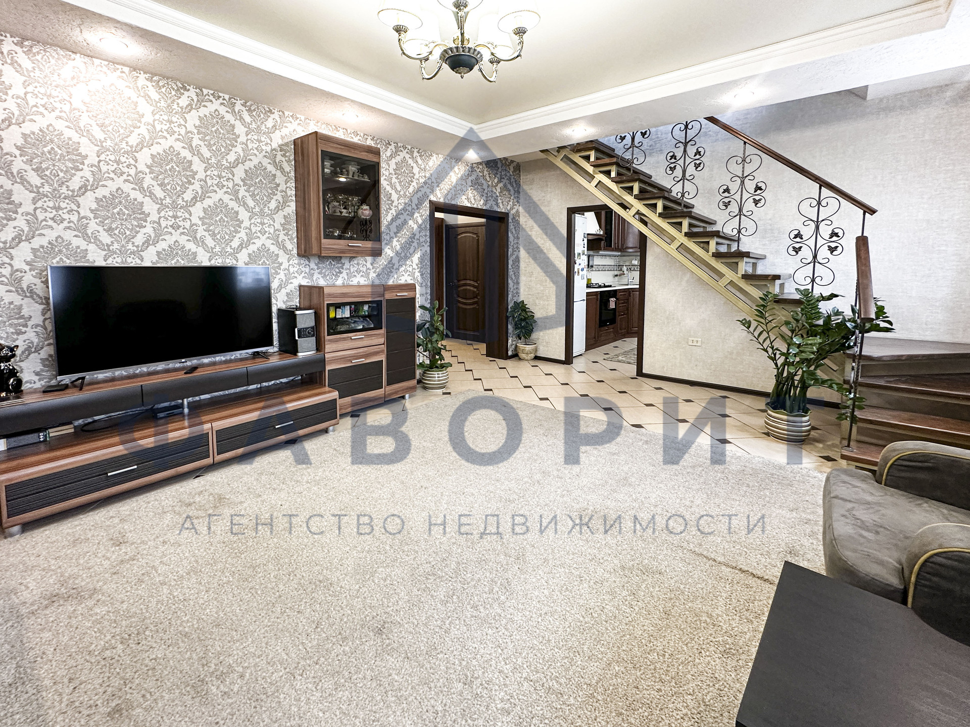 На первом этаже доме расположилась огромная гостиная, где можно собираться всей семьей и встречать гостей. Гостиная очень светлая за счет расположения в ней больших окон. Оснащена всем необходимым - современная мягкая мебель (диван и кресла), консоль под телевизор и шкафчики для хранения, даже шторы подобраны со вкусом. Так же, гостиную украшает лестничный марш, ведущий на второй этаж. Добротная ковка перил и остекление от первого этажа до потолка второго смотрятся шикарно. Ради этого вида и простора люди и переезжают в дом.