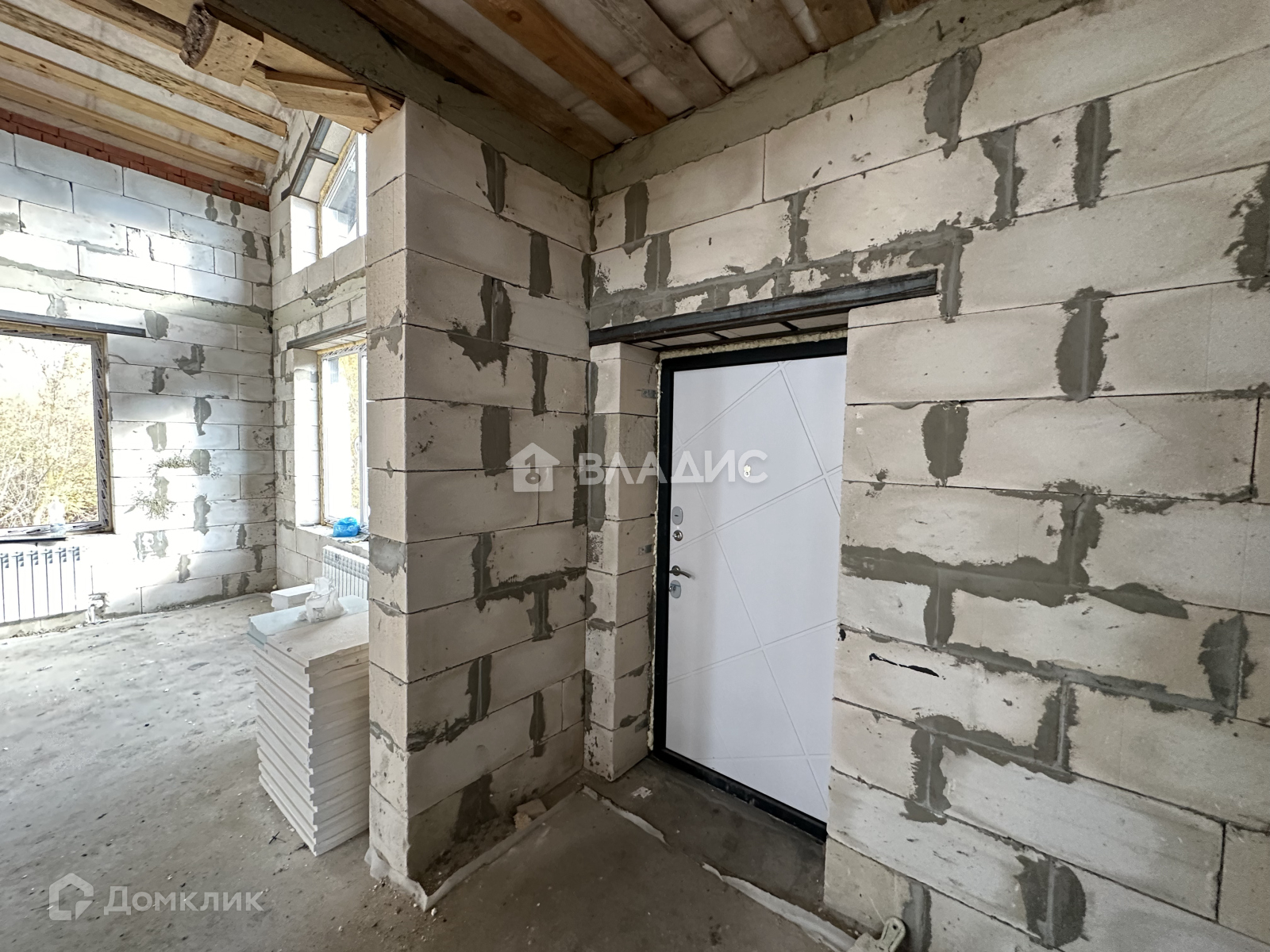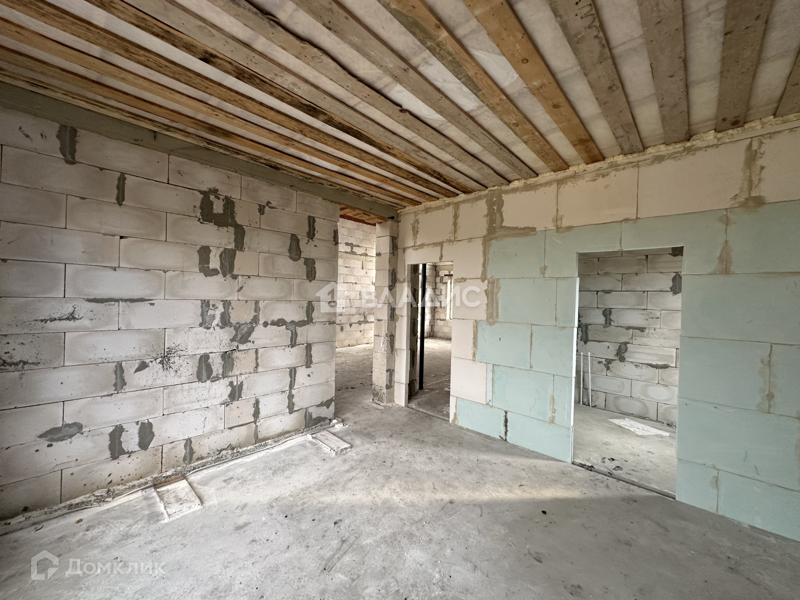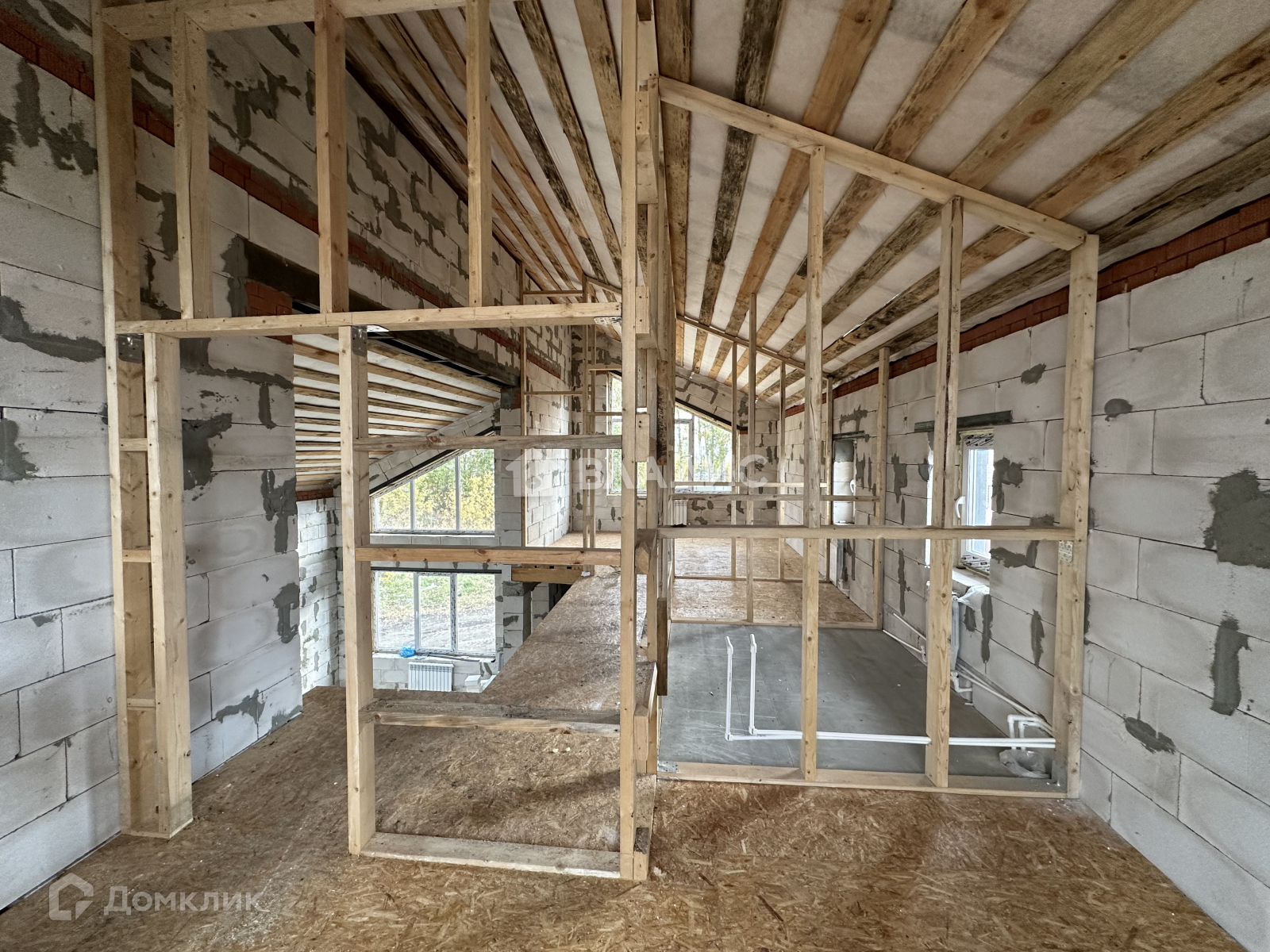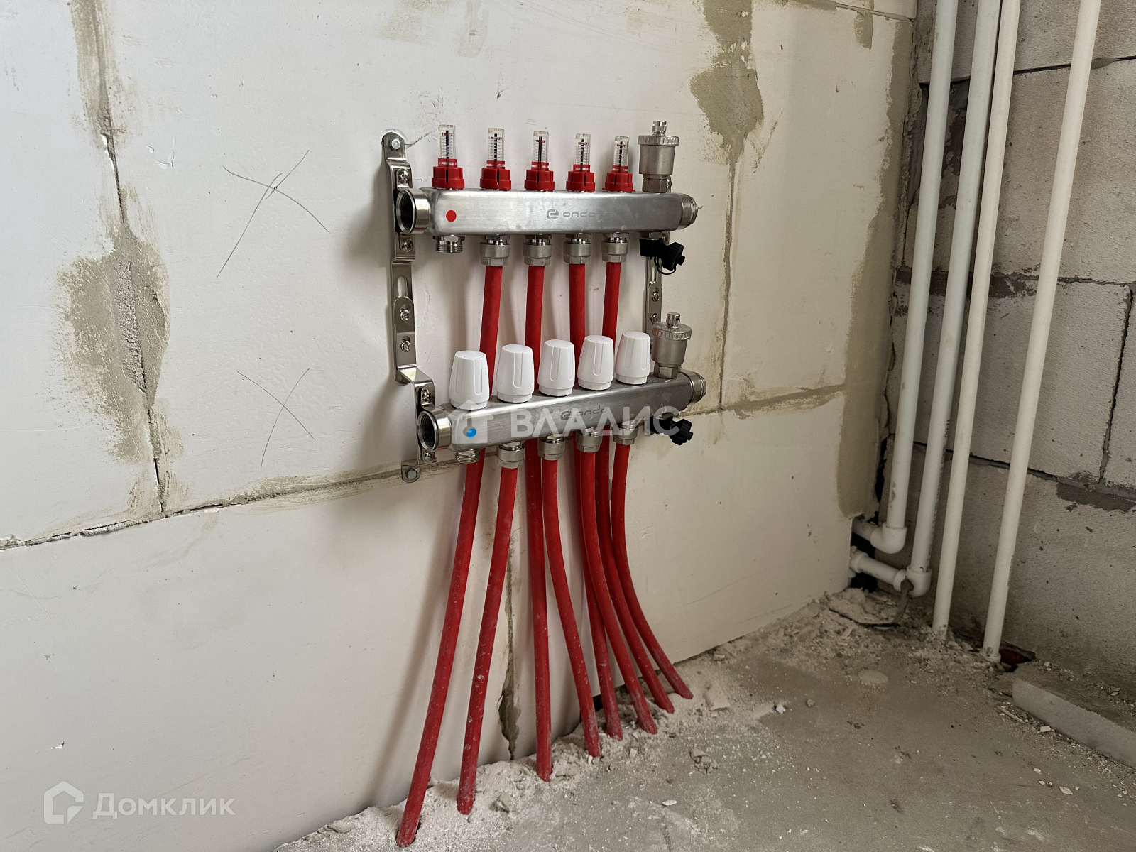 На первом этаже водяной теплый пол от газового котла, полусухая стяжка пола, стены отштукатурены.