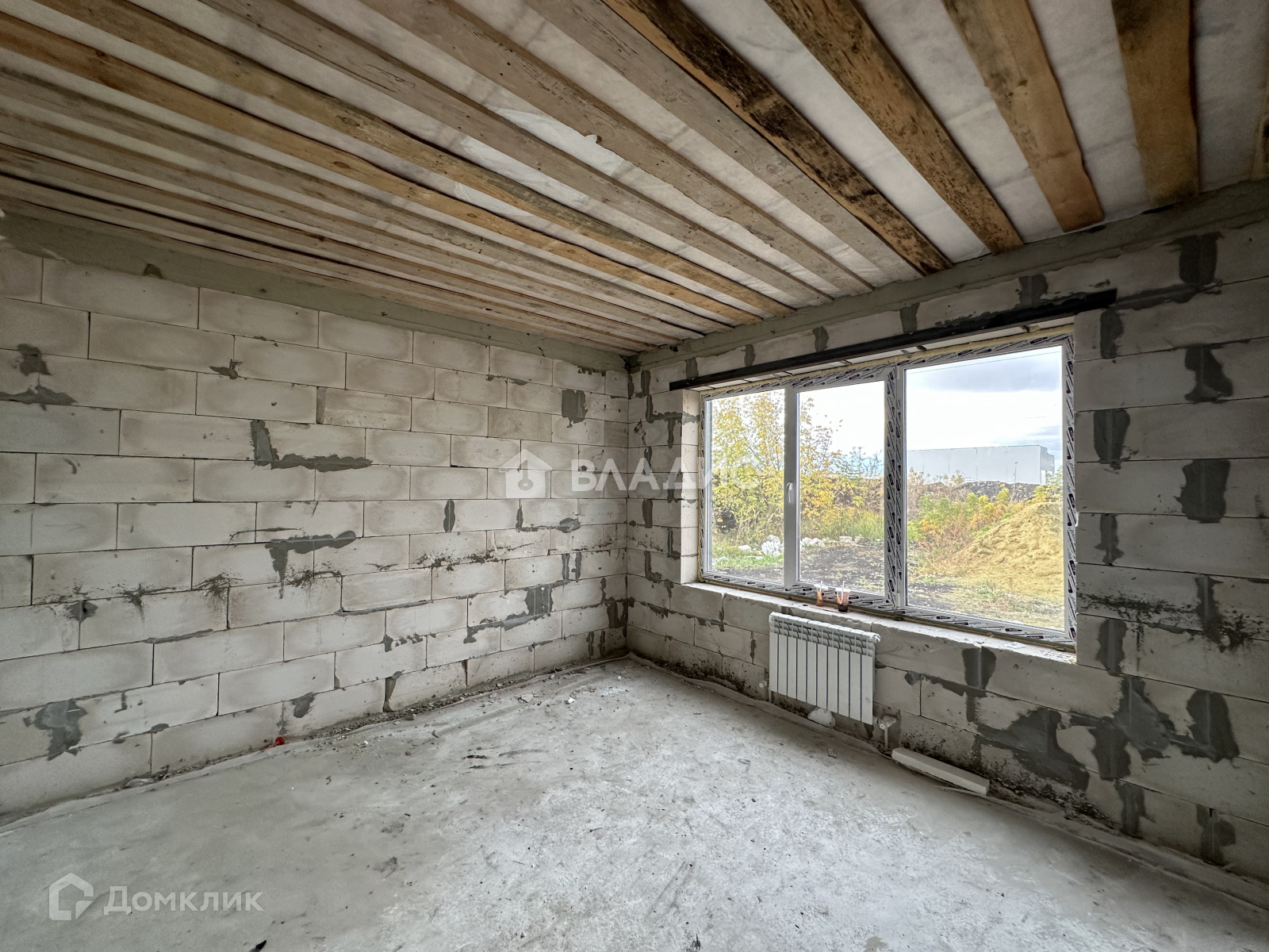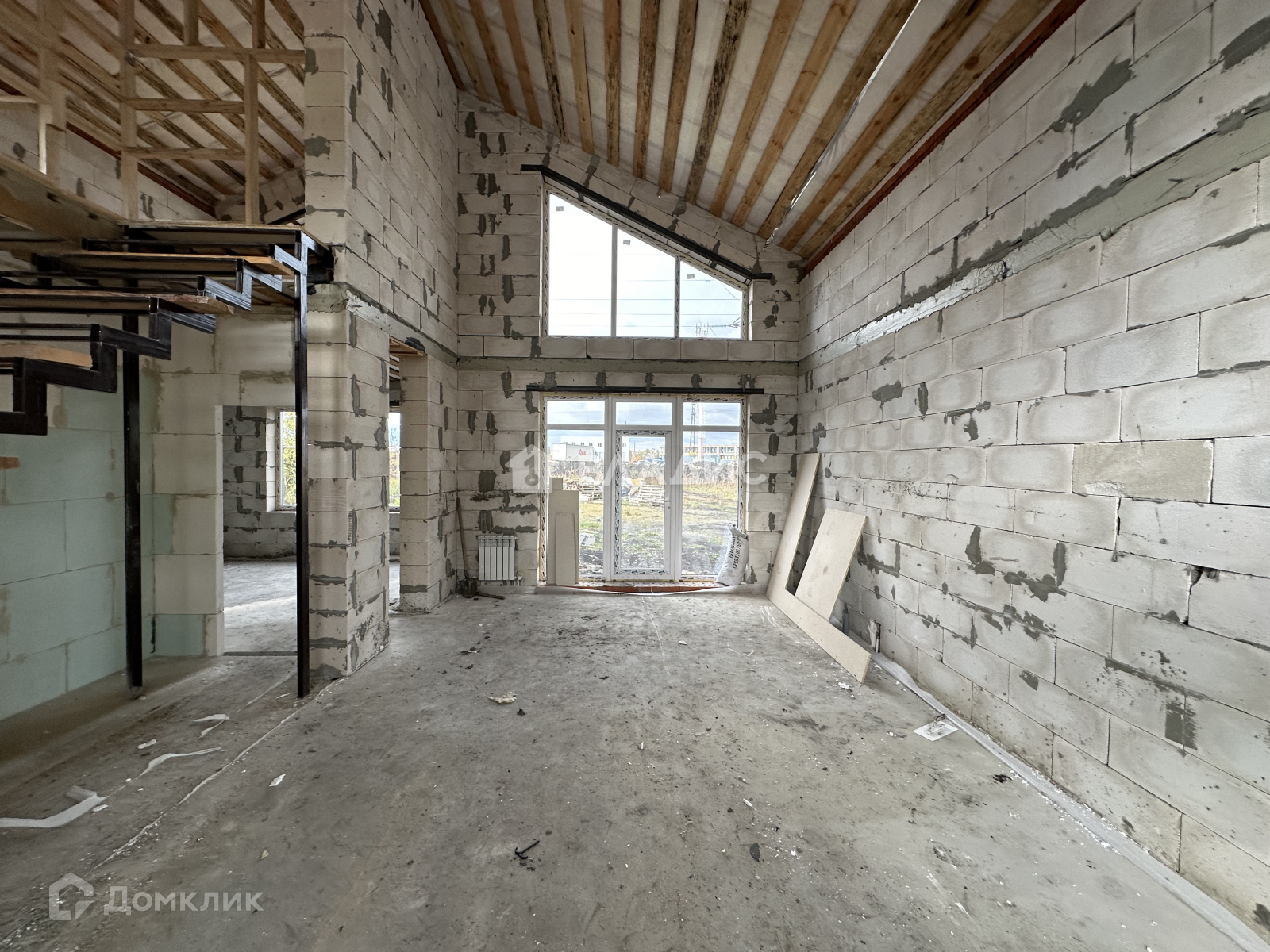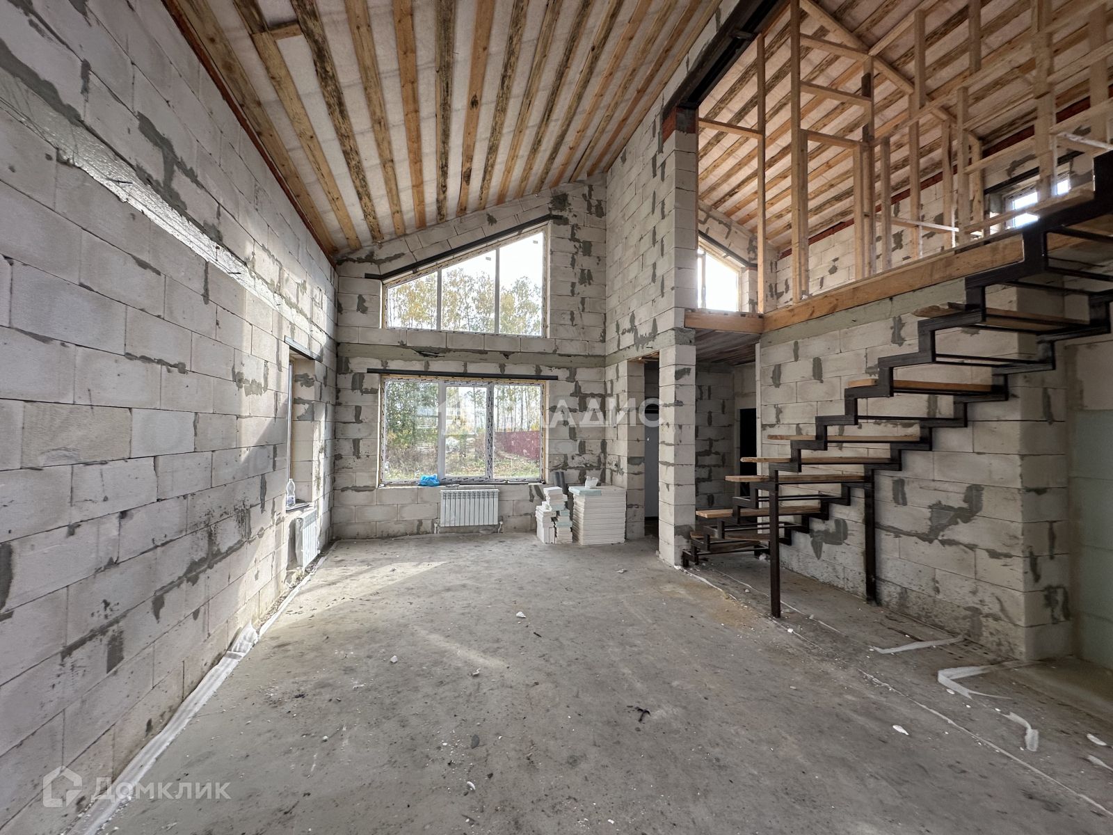 На первом этаже водяной теплый пол от газового котла, полусухая стяжка пола, стены отштукатурены.