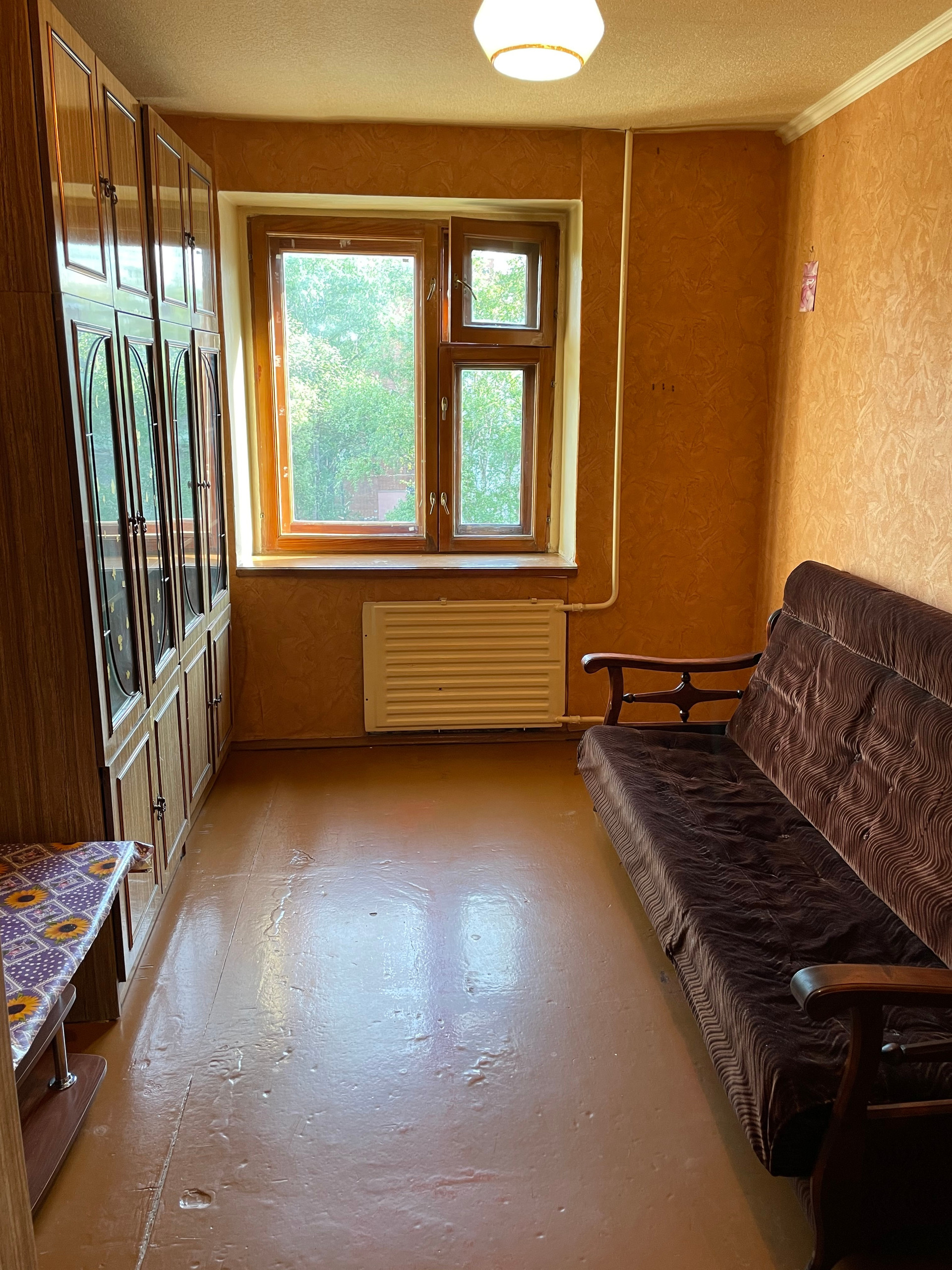 6/9 этажного кирпичного дома, 12 кв.метров, не угловая, деревянное евроокно, свободна от прописки и проживания, душ на 4, туалет на 2 комнат, своя кладовка, есть место под стиральную машинку