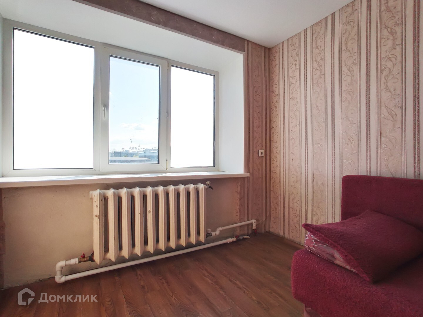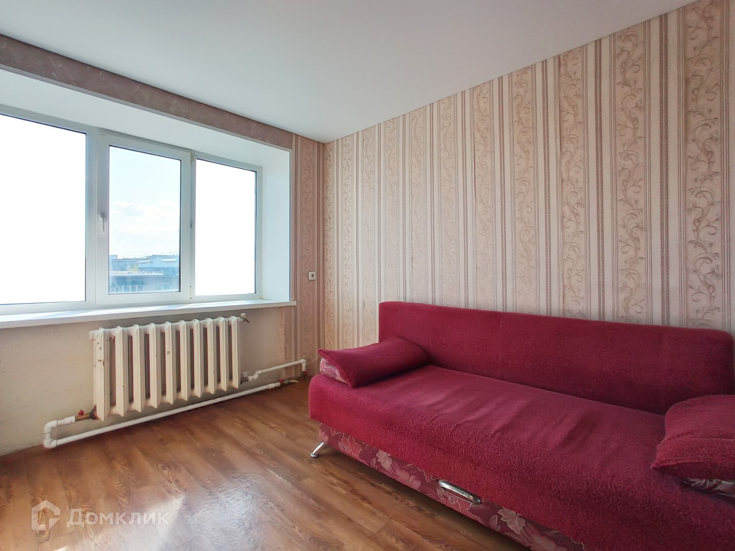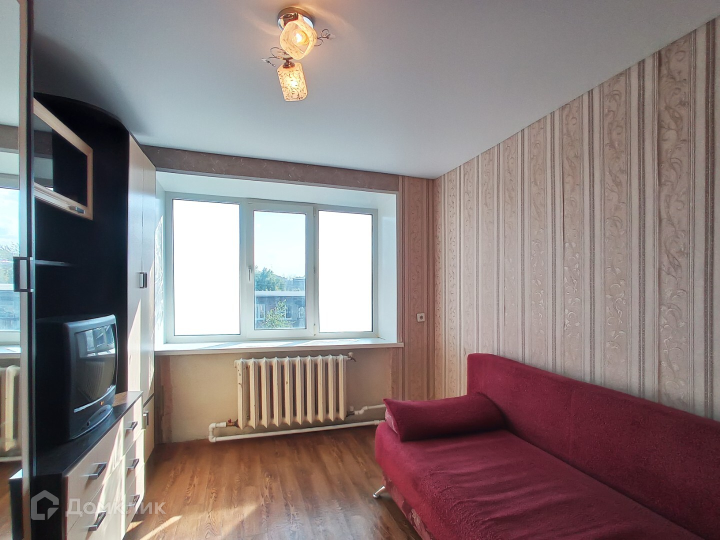В комнате: натяжные потолки, пластиковое окно, на стенах обои, на полу линолеум.