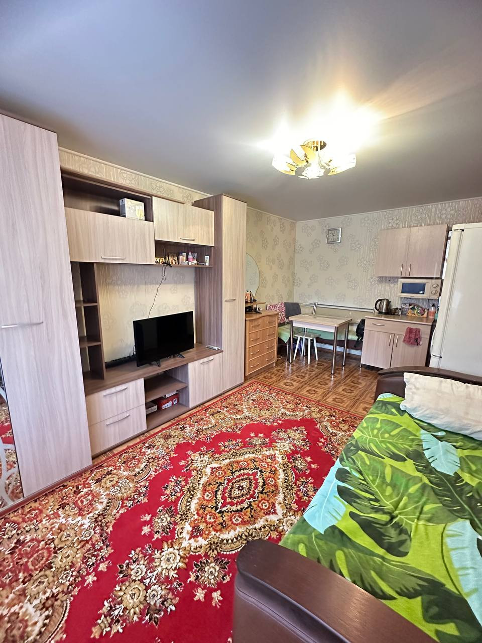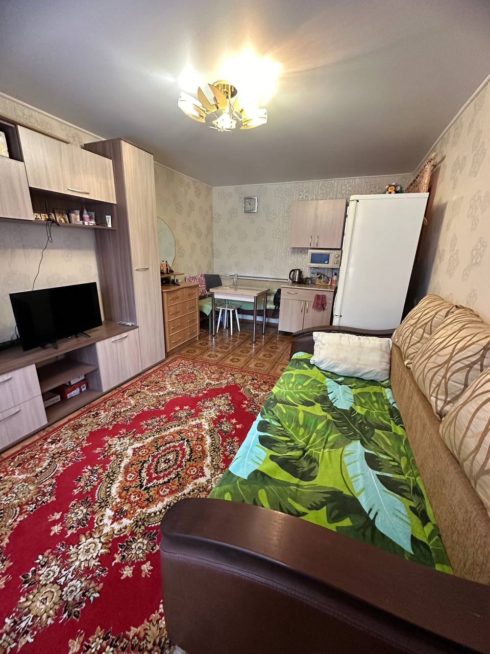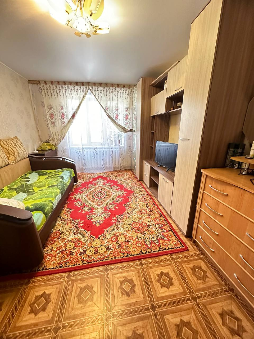 Комната светлая и теплая. С ремонтом, линолеум, натяжные потолки, пластиковое окно. В комнате выведена вода, отделена зона кухни. Хорошие соседи. Места общего пользования чистые.