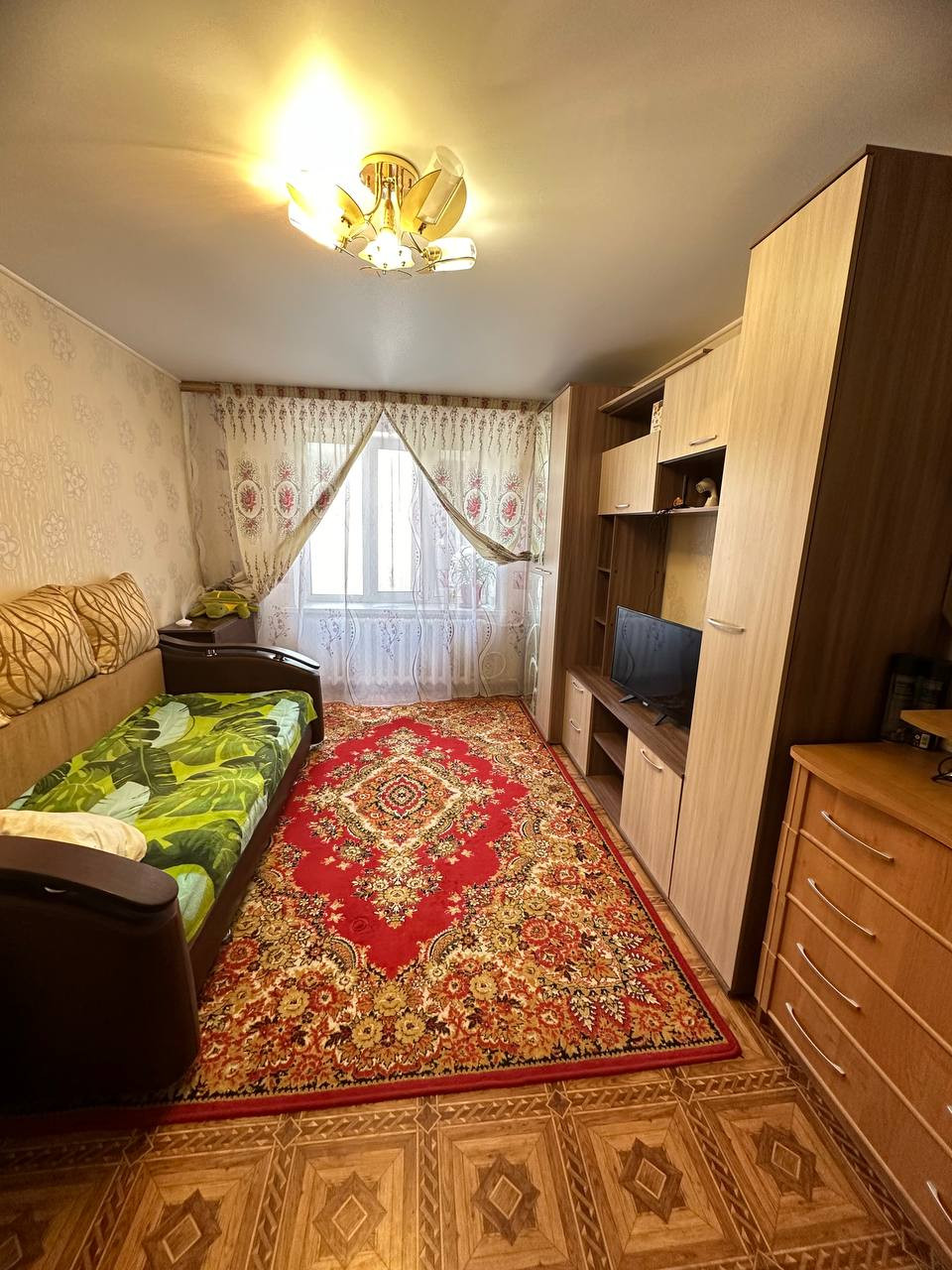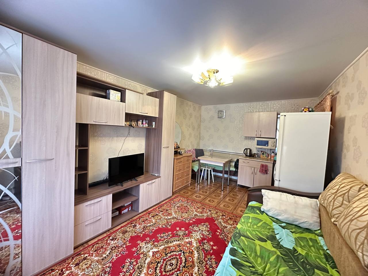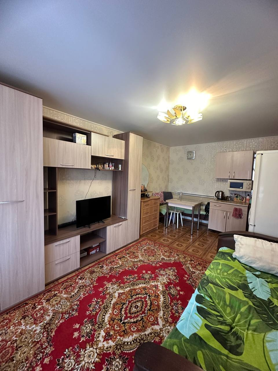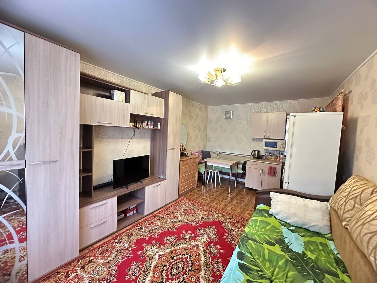 Комната светлая и теплая. С ремонтом, линолеум, натяжные потолки, пластиковое окно. В комнате выведена вода, отделена зона кухни. Хорошие соседи. Места общего пользования чистые.