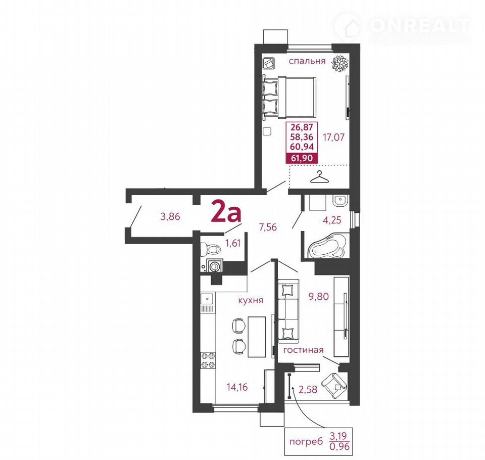 Общая площадь 61.9 м2