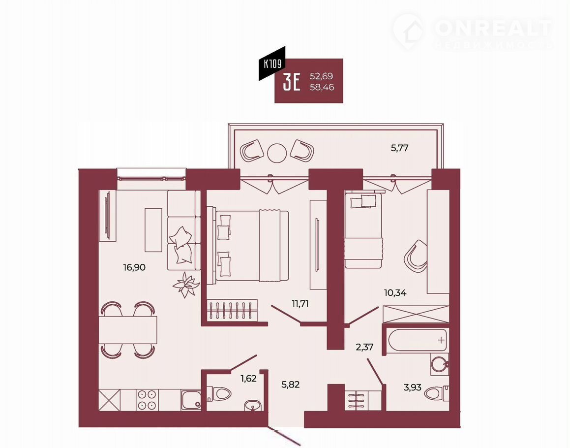 Общая площадь 58.5 м2