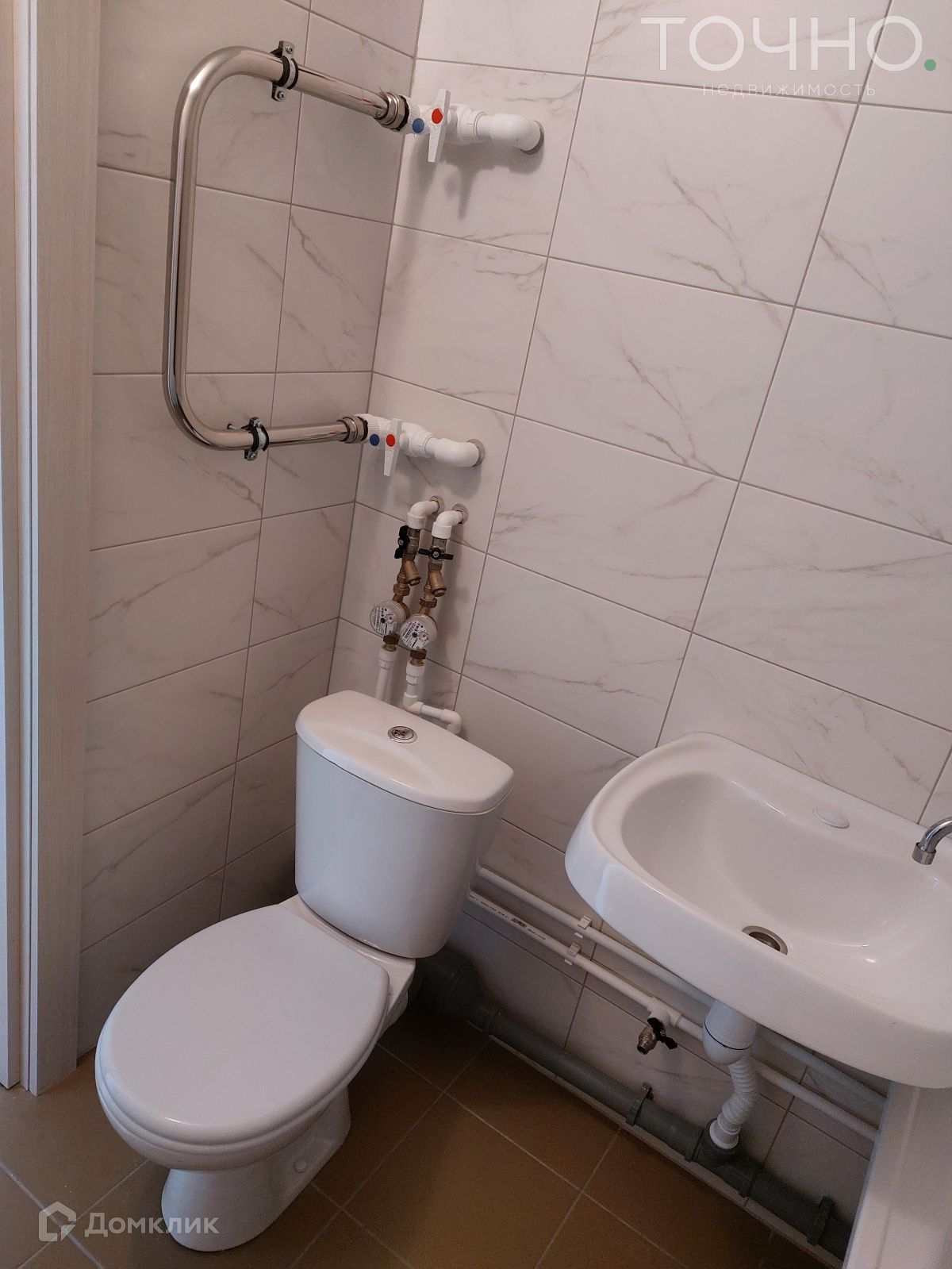 Совмещенный санузел в кафеле, установлены счетчики и краны.