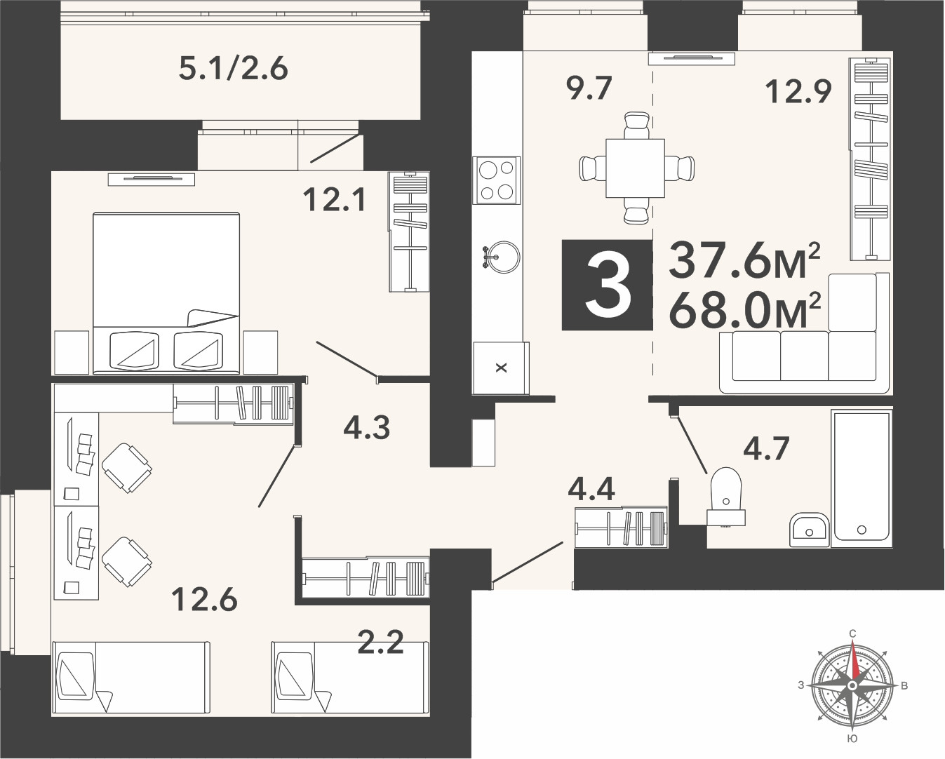 Общая площадь 68 м2