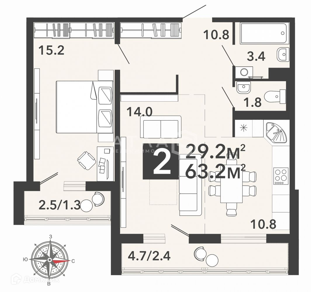 Общая площадь – 63.2 кв.м,