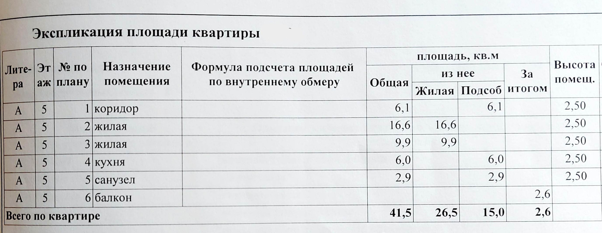 Общая площадь 41.5 м2