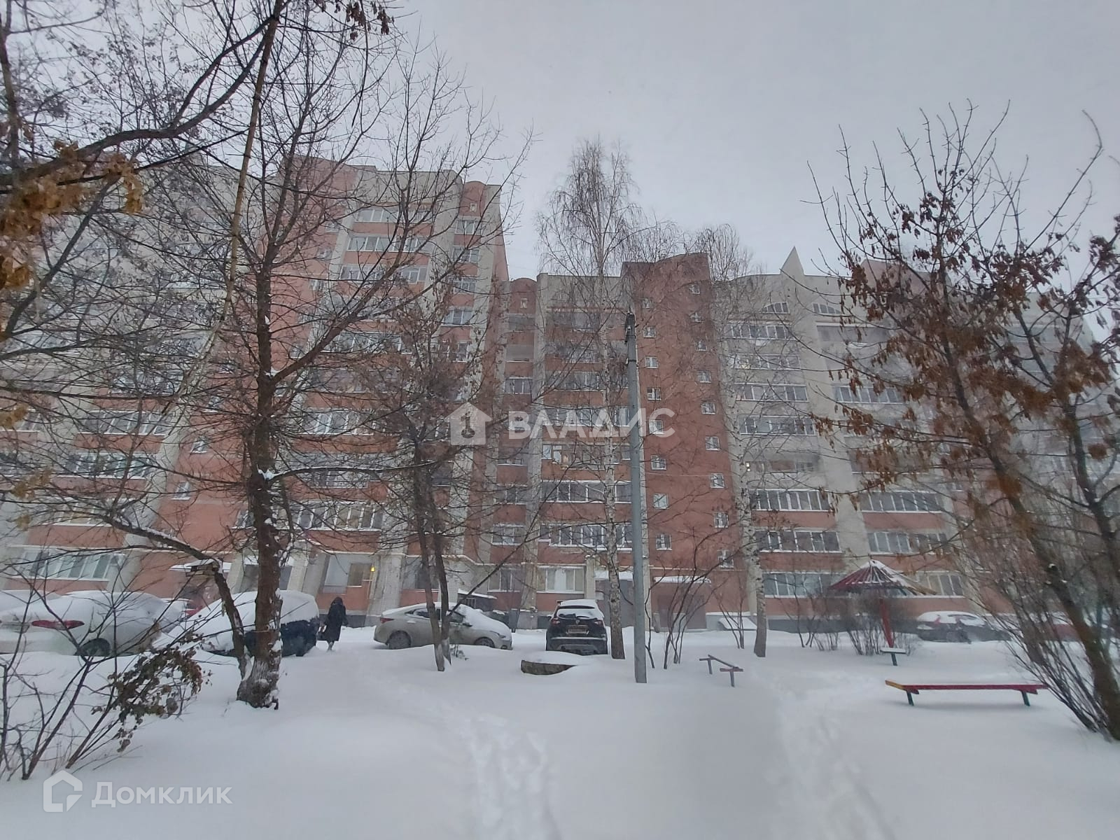Территория дома огорожена, во дворе современная детская площадка.