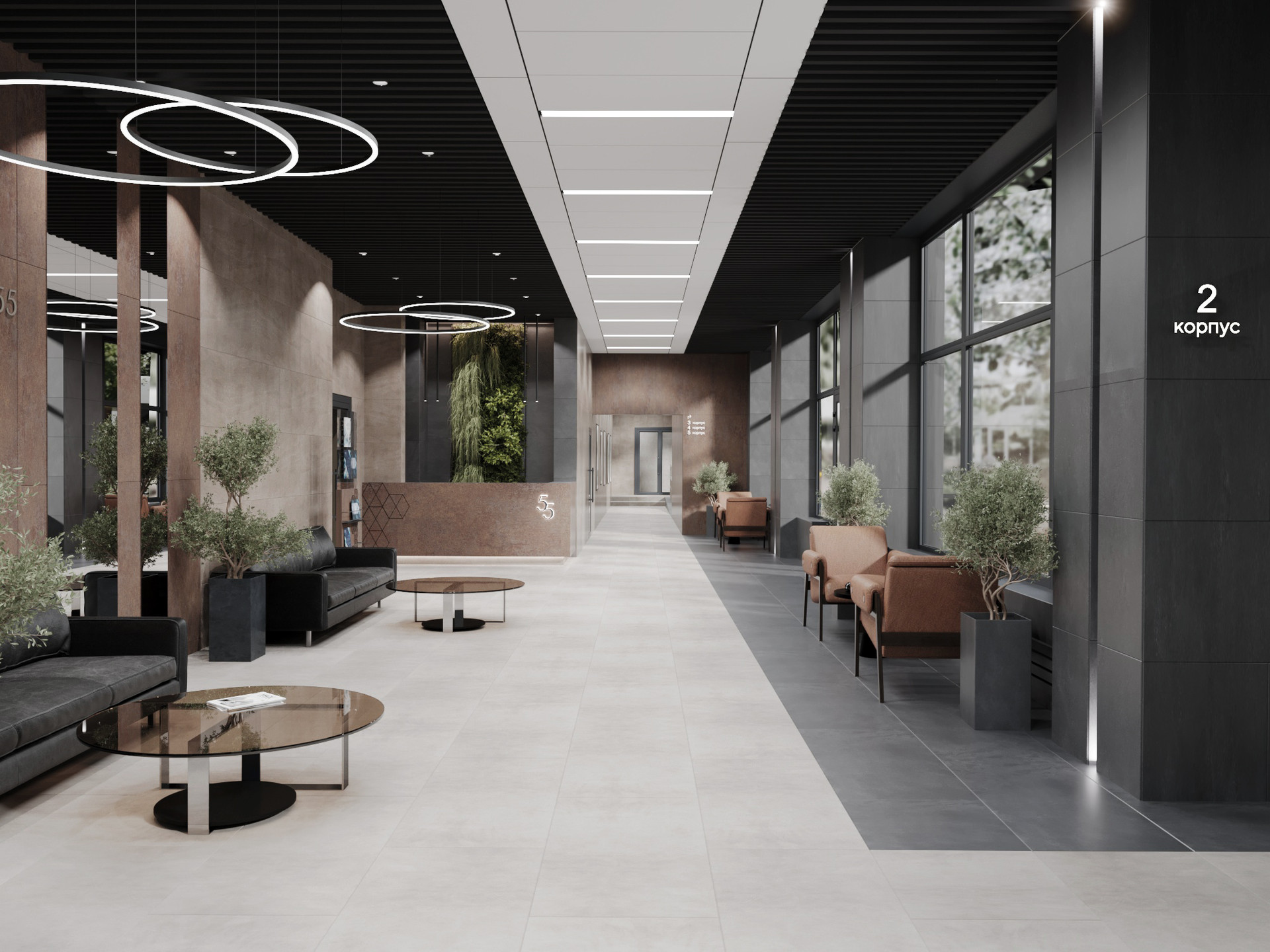 Пять высотных башен от 7 до 18 этажей объединены общей галереей на 1 этаже, где будут размещены коммерческие помещения, лаунж-зоны, собственная галерея искусств.