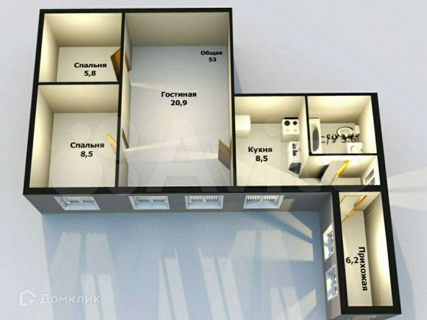 Общая площадь 53 м2