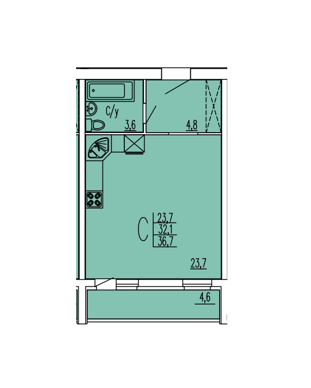 Общая площадь 36.7 м2