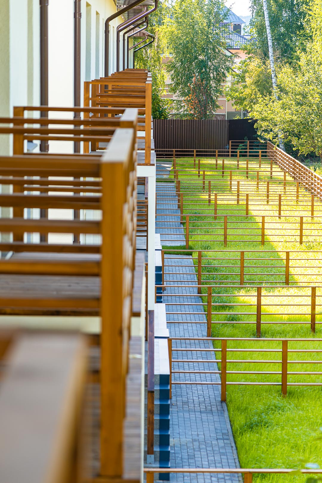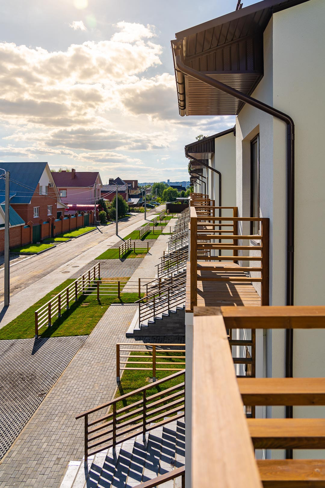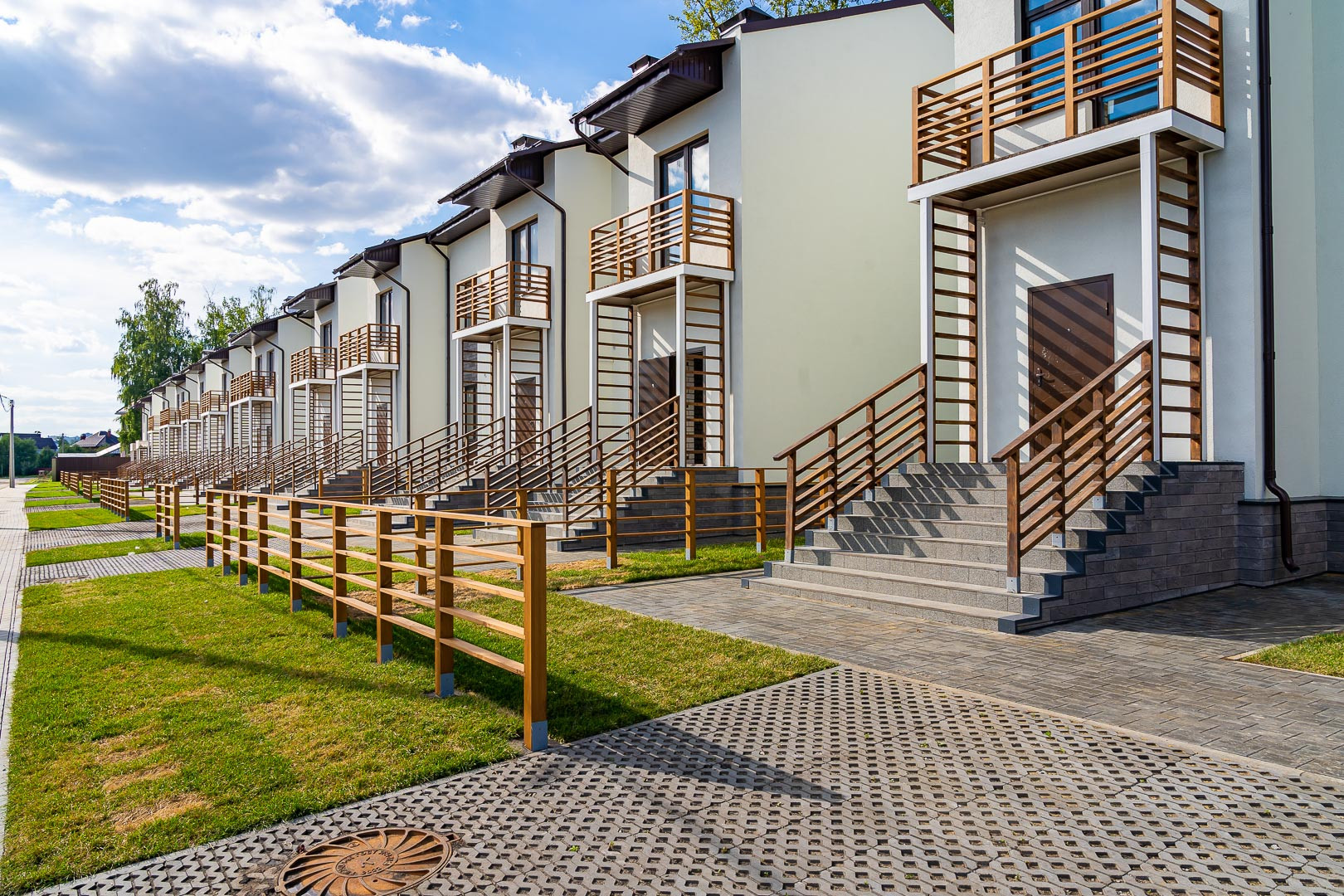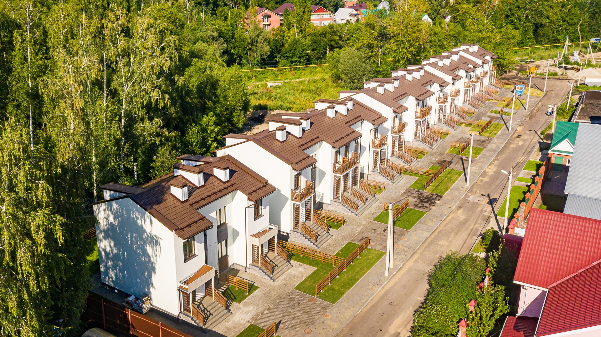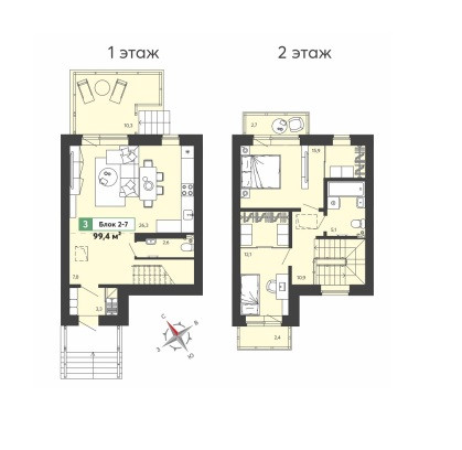 Таунхаус на две семьи. Предусмотрена парковка для автомобиля перед домом с георешеткой и задний дворик с озеленением. На двух этажах квартиры предусмотрены просторная кухня-гостинная с выходом на внутренний двор, два санузла (один из них с окном), две спальни с балконами. Квартира продается без отделки, но уже заведены все необходимые коммуникации: централизованная канализация, водоснабжение, индивидуальное отопление от котла, радиаторы установлены, газоснабжение. Также в квартире уже выполнена стяжка пола, заведена электроразводка, каркас лестницы на второй этаж.