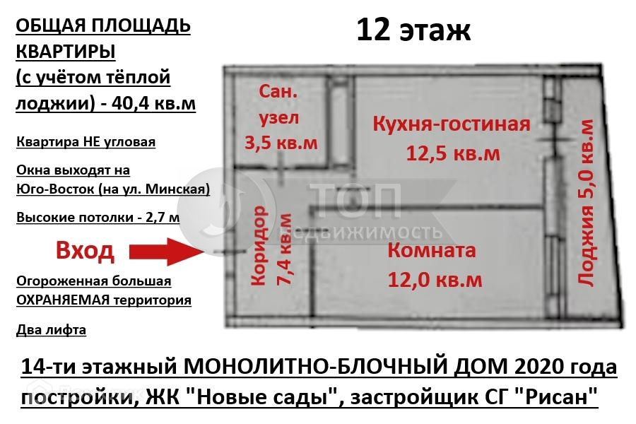 ОБЩАЯ ПЛОЩАДЬ КВАРТИРЫ (с учётом тёплой лоджии): 40,4 кв.м (кухня-гостиная 12,5 кв.м, комната 12,0 кв.м, коридор 7,4 кв.м, сан. узел совмещенный 3,5 кв.м, тёплая лоджия 5,0 кв.м).