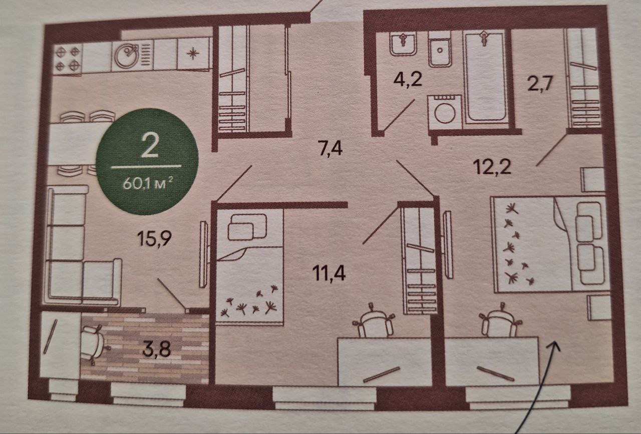 Квартира с просторной кухней гостиной 16 кв.м., жилая комната 12,2 кв.м., жилая комната 11,4 кв.м., просторный холл, 2 гардероба, теплая лоджия 3,8 кв.м.