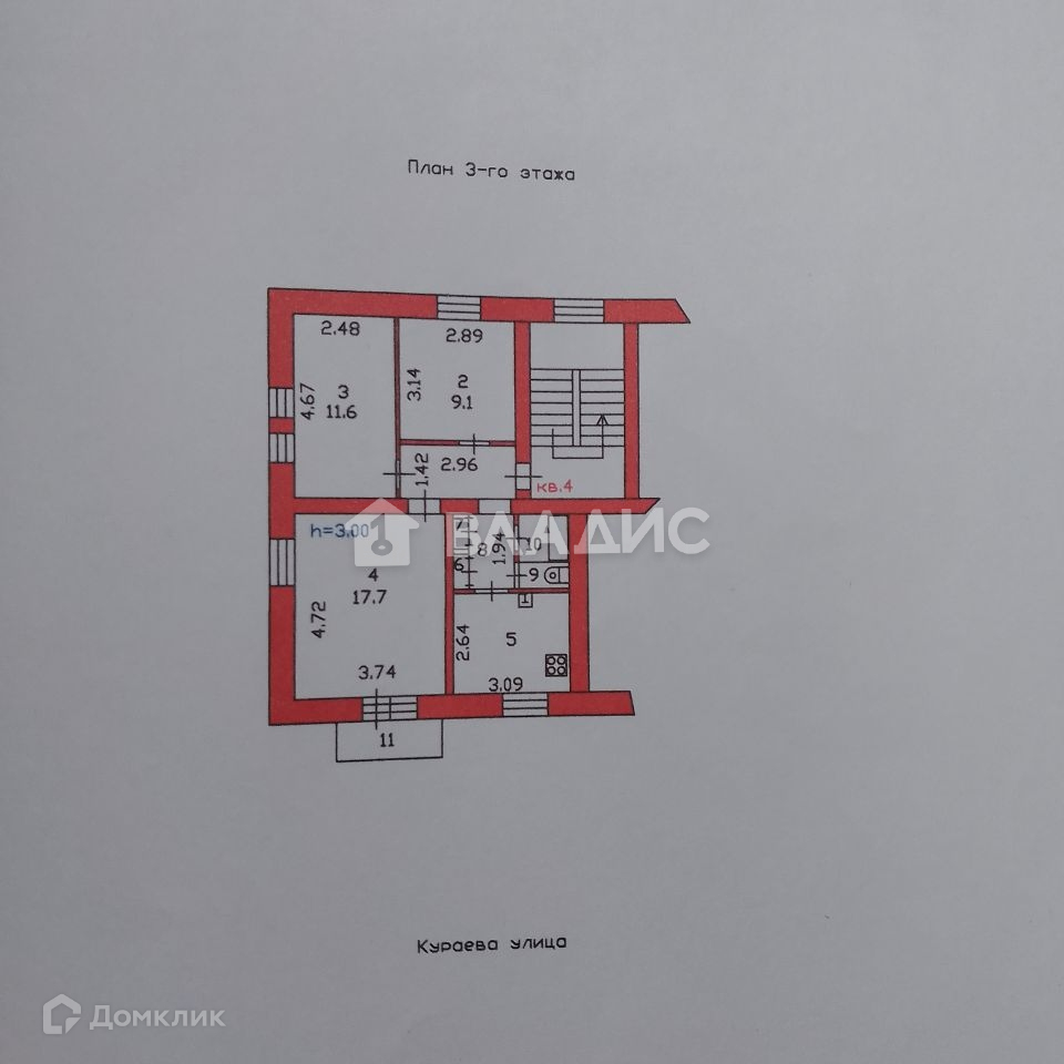 3-комнатная квартира, 56.5 м2, этаж 3 / 3, на продажу в Пензе, улица Кураева, 4