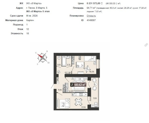 2-комнатная квартира, 68.6 м2, этаж 12 / 18, на продажу в Пензе, улица 8 Марта, 31к5