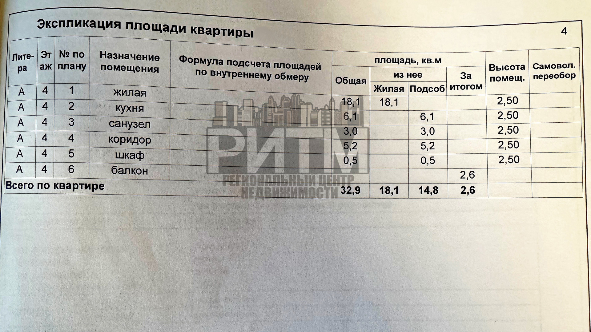 Общая площадь 32.9 м2