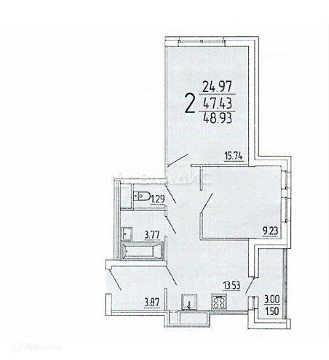 Общая площадь 47.4 м2