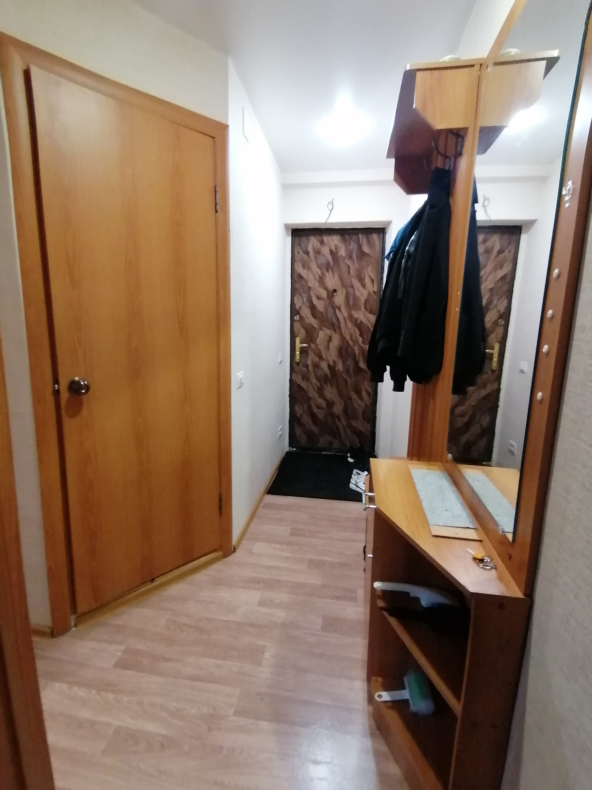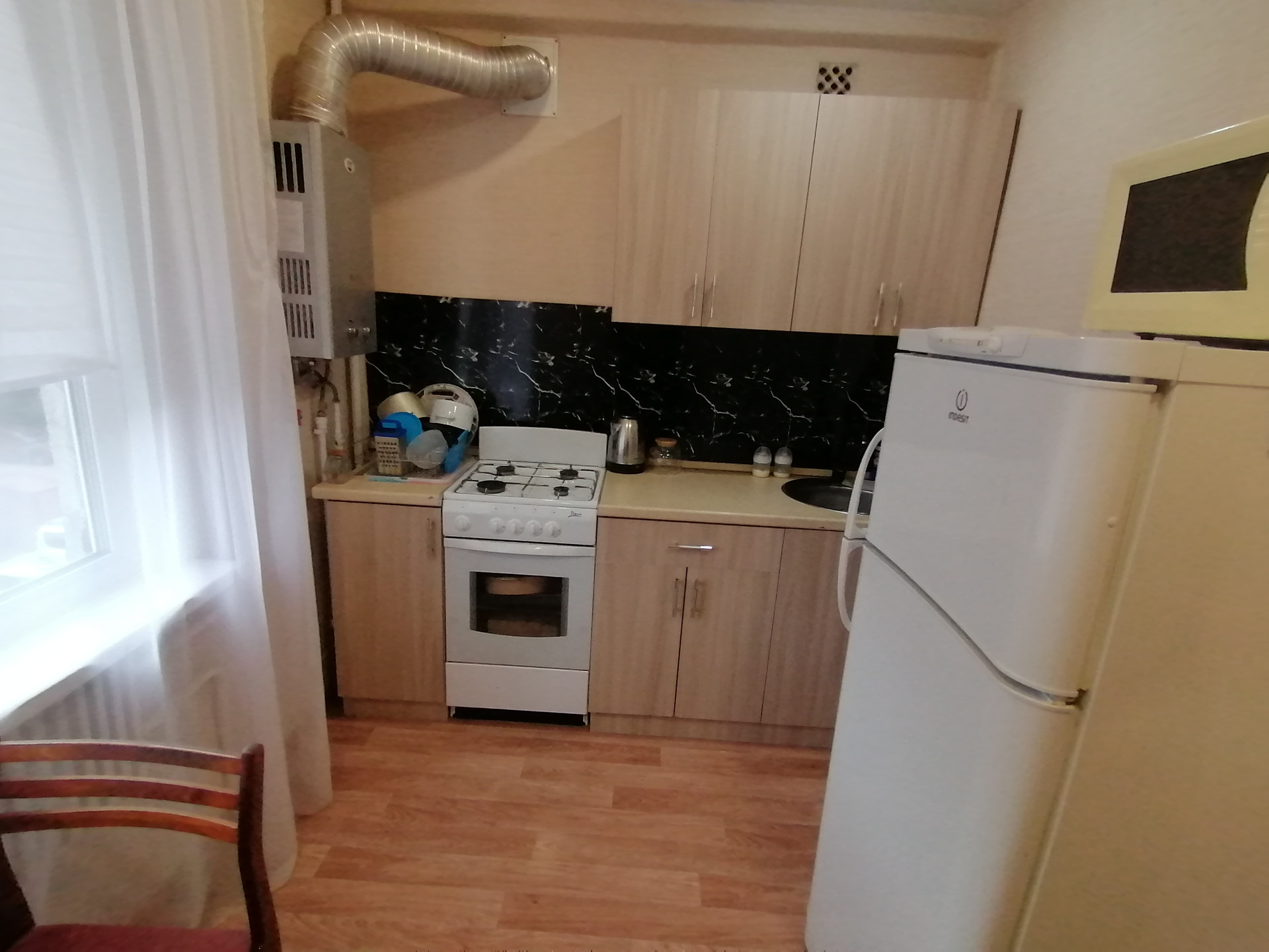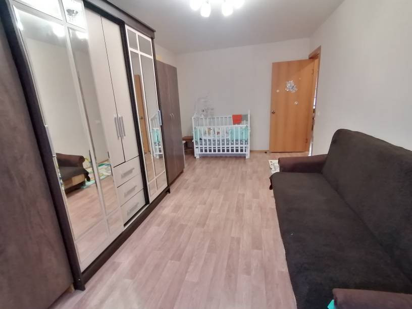 В квартире остается кухонный гарнитур, холодильник, стол, стулья, крова, шкаф, диван, шкаф в комнате, машинка стиральная, прихожая.