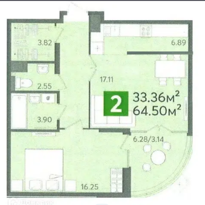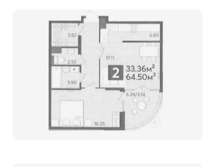Общая площадь 64, 5м2 . Жилая 33, 36м2 . Большая Кухня-гостиная . Лоджия 6, 28м2 . Просторная прихожая с гардеробной