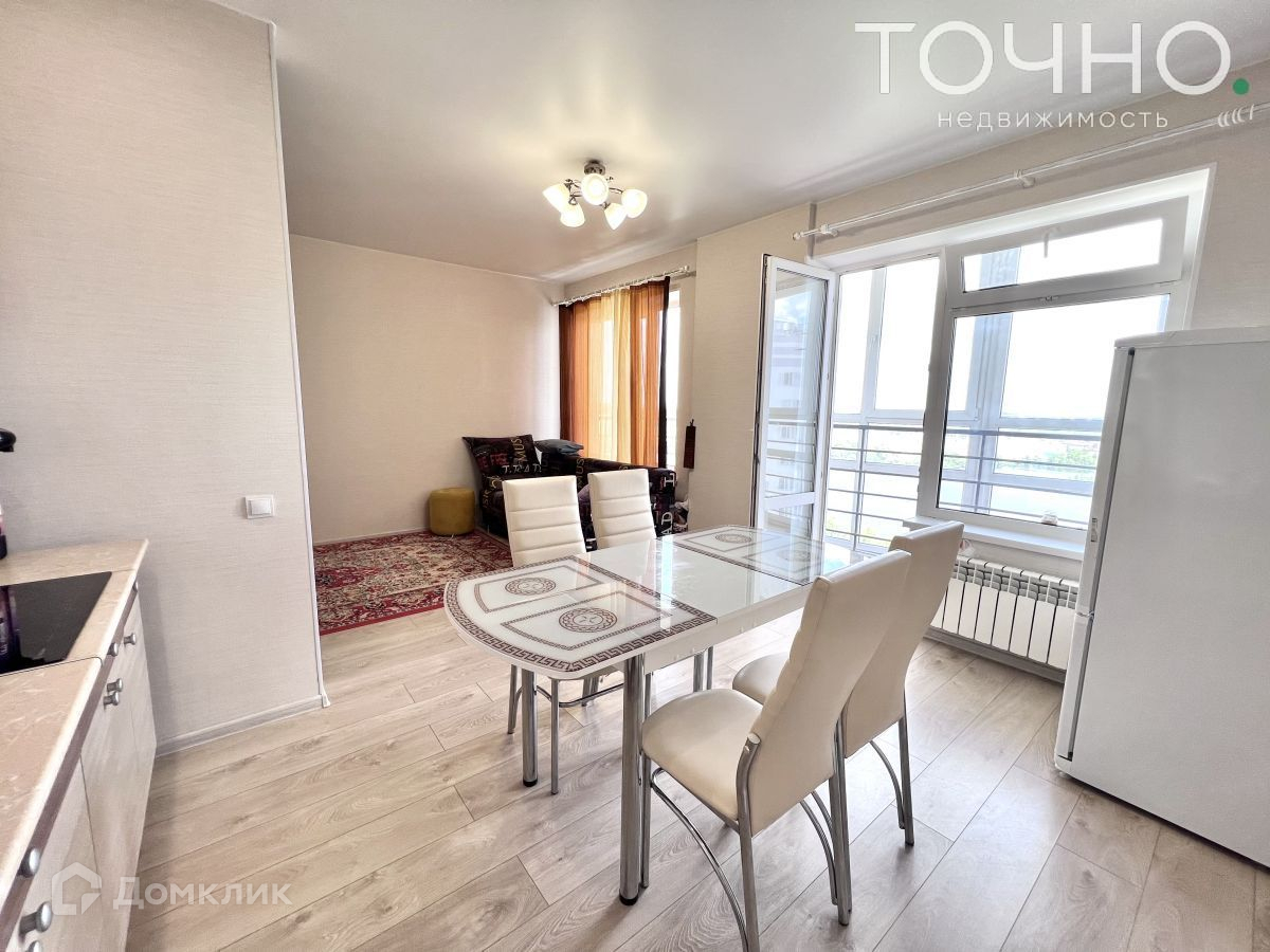 Кухня гостиная с выходом на  большую застекленную панормамную лоджию, откуда открывается  шикарный вид на город и реку.