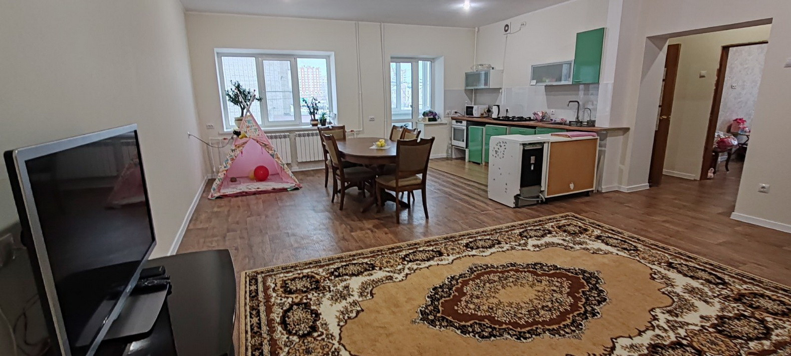 Продаётся отличная и уютная квартира по адресу улица Антонова, дом 15. Квартира расположена на 2 этаже 3-х этажной секции кирпичного дома, год постройки 1997, площадь квартиры 100.5 кв.м (без учета балкона), кухня-столовая совмещенная с гостиной 40.8 кв.м, две комнаты изолированные 16.2 кв.м, 11.7 кв.м, просторный коридор 14.4 и 7.9 кв.м, высота в помещении 2,55 м, площадь балкона 6.3 кв.м, с/у раздельный (ванная 4.1 кв.м, туалет 2.2 кв.м). Квартира после капитального ремонта: замена стояков водоснабжения, канализации и отопления, замена приборов учёта, замена радиаторов (установлены радиаторы по 12 секций), замена электропроводки по всей квартире с установкой автоматов и УЗО, установлены новые оконные блоки Rehay, отделка балкона (застеклен, утеплен), потолок выровнен с установкой встроенных светильников, выровнены стены, на полу керамогранит и линолеум 43 класса, установлена система очистки воды (гейзер Аллегро), отделка фартука на кухне керамогранитом с установкой столешницы и газовой варочной панели, германская сантехника (чугунная ванна, комплектующие и расходные материалы производство Германии и Франции), установлен в санузле электрический бойлер, новая входная металлическая дверь. Просторный тамбур на 4 квартиры, в пользовании кладовое помещение в подвале дома. Отличное расположение дома, в шаговой доступности - школа, детский сад, магазины, Сбербанк, Ледово-спортивный комплекс Золотая Шайба, магазин Магнит, ТЦ Восток, ТЦ Лента, остановка общественного транспорта.
