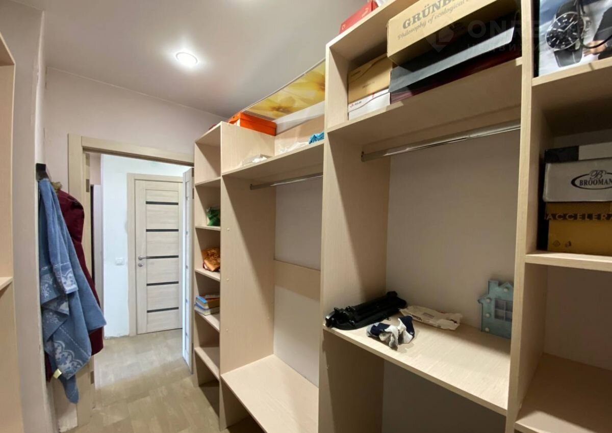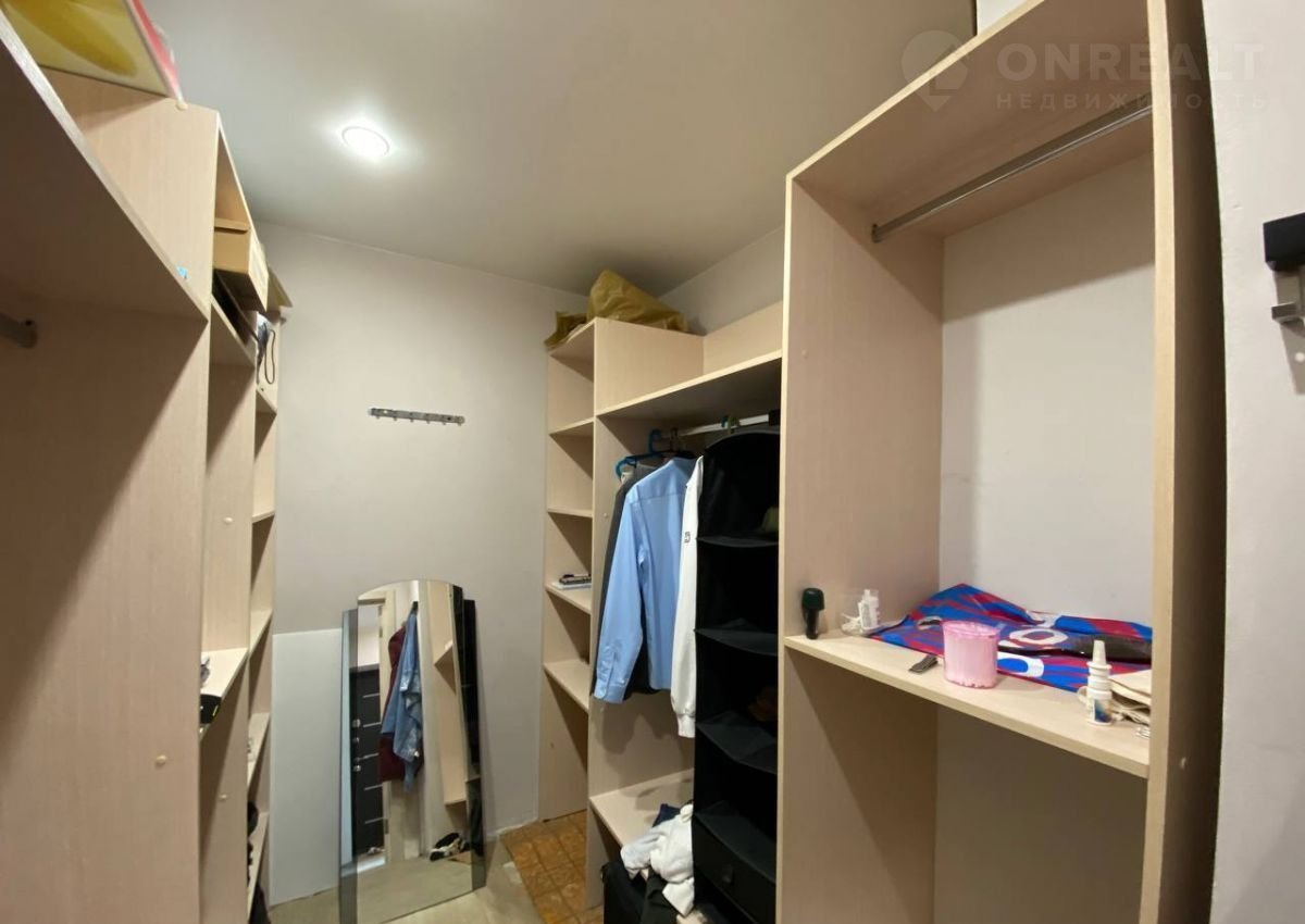 В квартире оборудована просторная и светлая гардеробная с вместительными стеллажами.