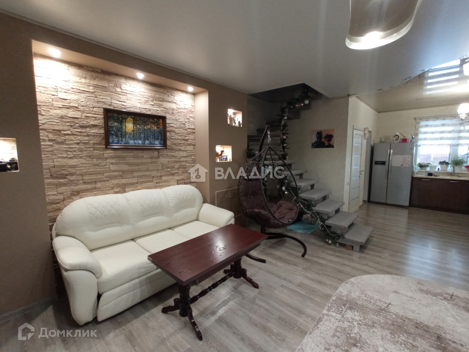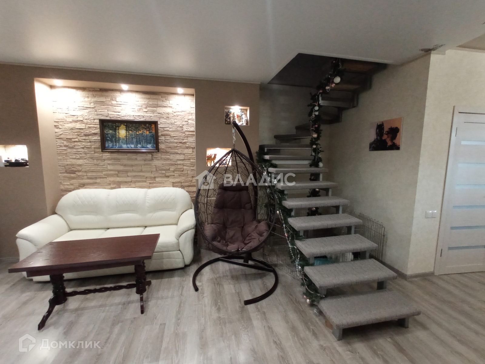 Металлическая лестница с деревянными ступеньками ведёт на второй этаж.