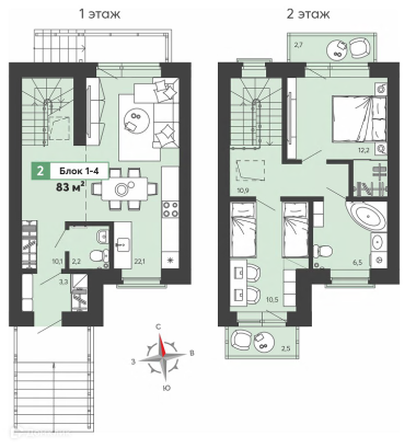 Кухня-гостинная на первом этаже и две спальни на втором вместе с санузлами на каждом этаже создают гармоничное пространство для комфортного обитания.