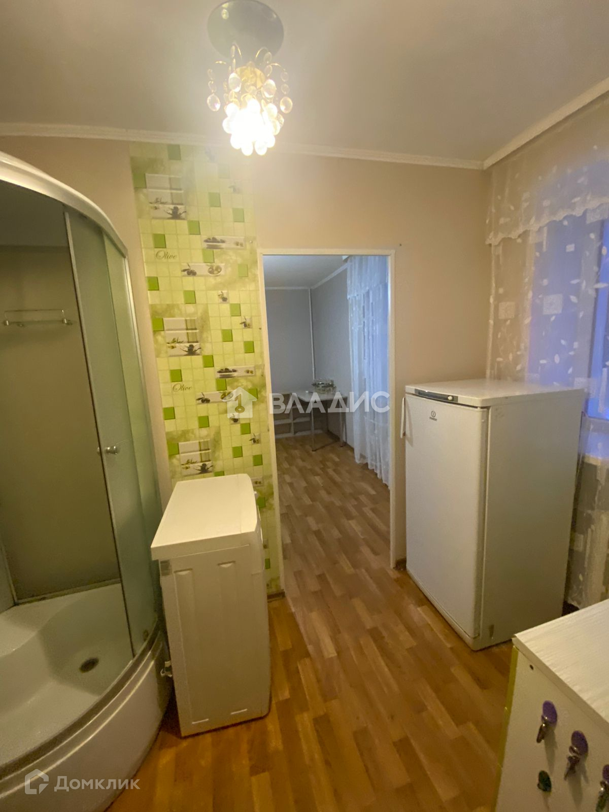Комната зонирована и оборудована всей необходимой мебелью для незамедлительного заселения и комфортного проживания - мебель для хранения, спальное место, стиральная машинка, холодильник, кухонный уголок с раковиной, душевая кабина.