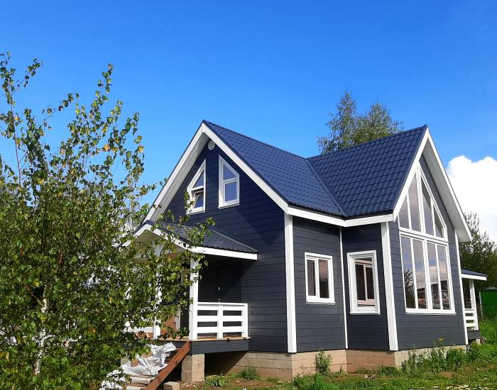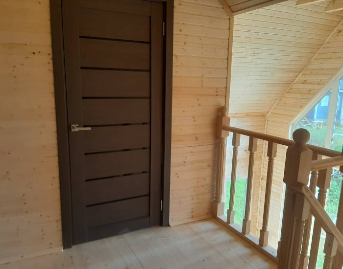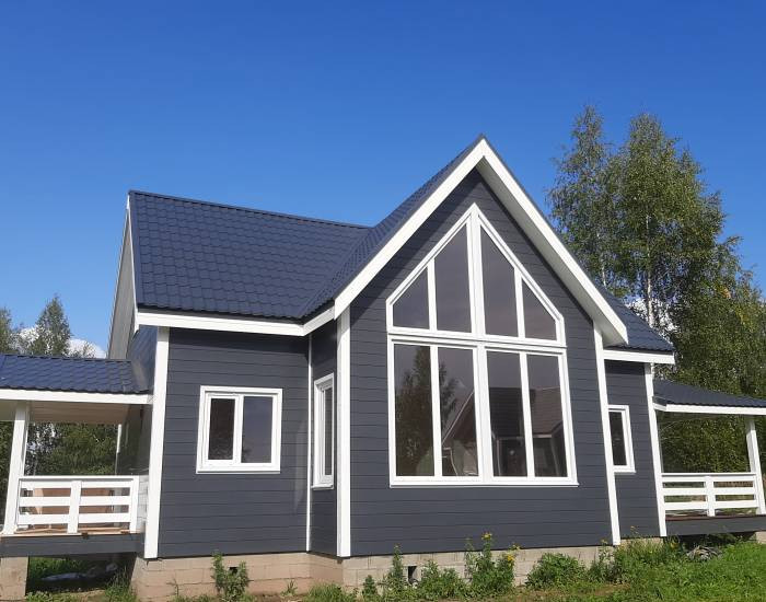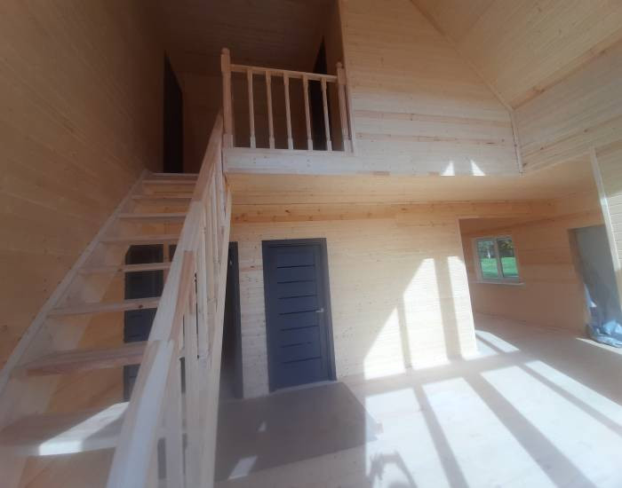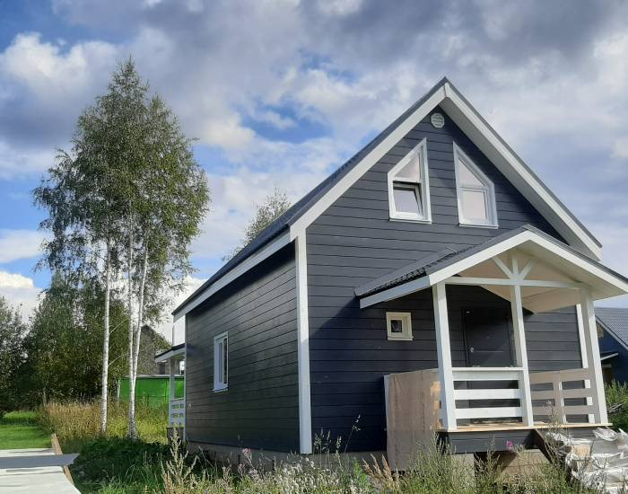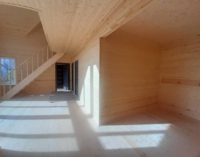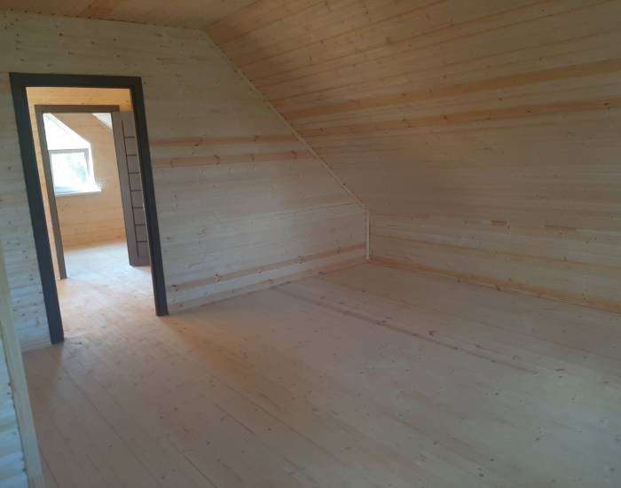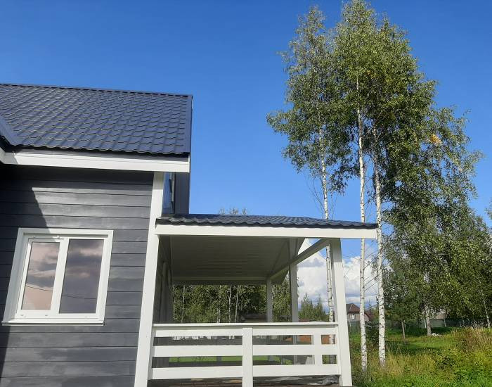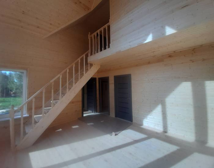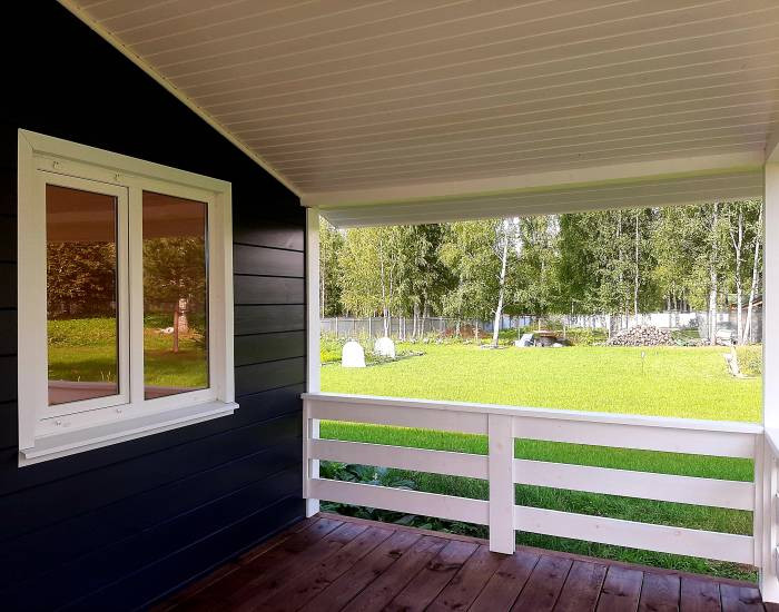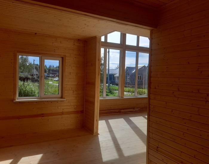 В доме функциональная планировка. 4 спальни, гостиная с зоной кухни, сан узел, холл, прихожая, сауна, просторная веранда. Панорамное окно гостиной выходит на солнечную сторону.