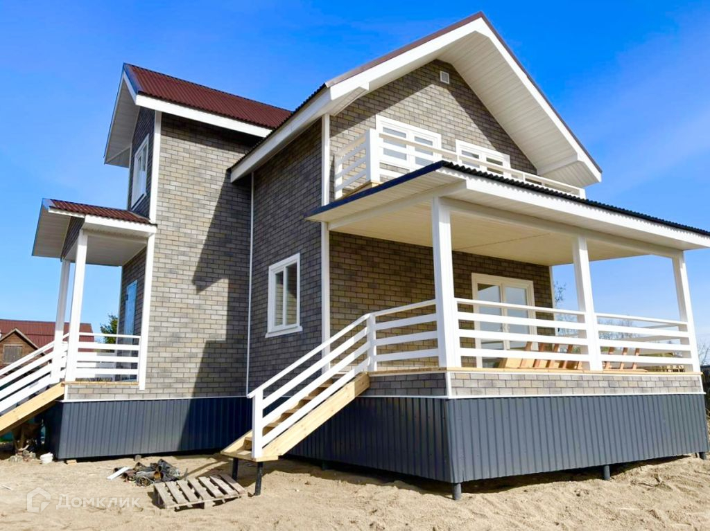 Планировка: Тамбур, прихожая, кухня-гостиная с выходом на веранду, спальня, санузел. На втором этаже три спальни, две из них с выходом на балкон, гардеробная, санузел.