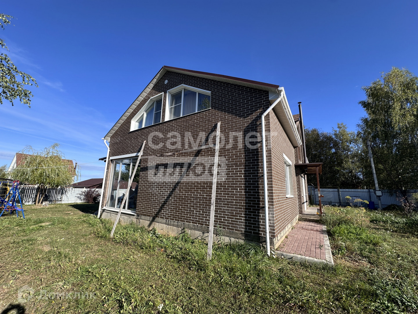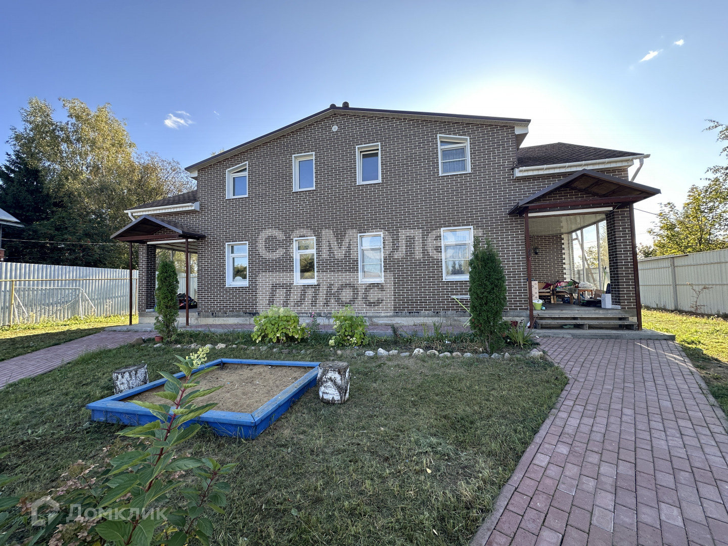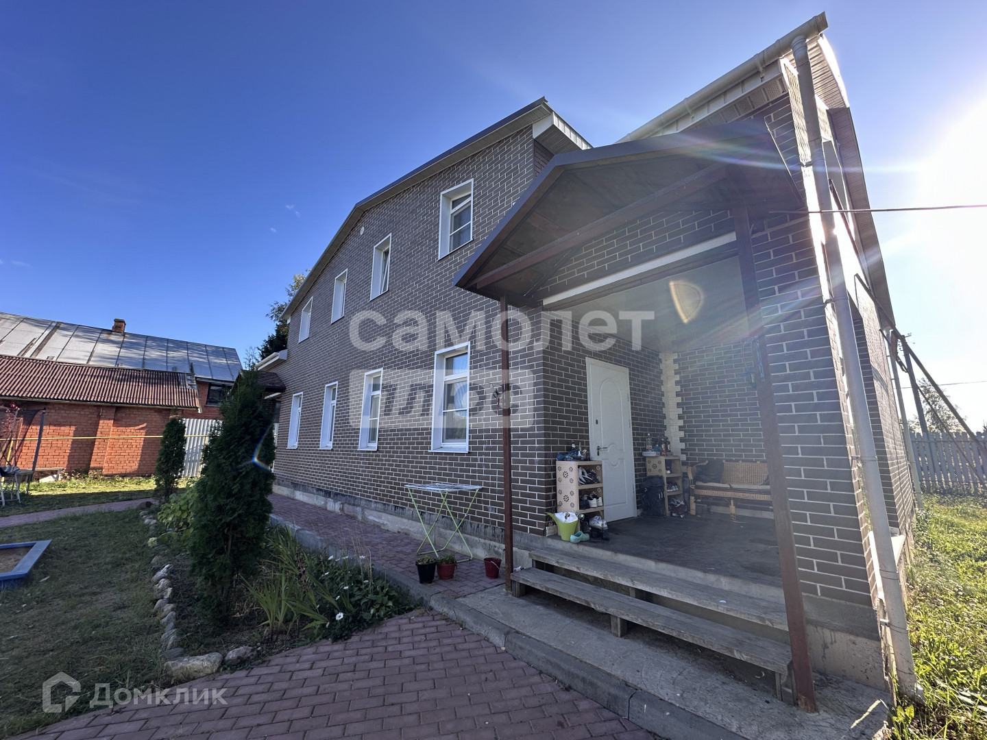 Дом построен из бруса, фасад отделан облицовочным кирпичом. Внутри всё готово к заселению: есть мебель, техника.