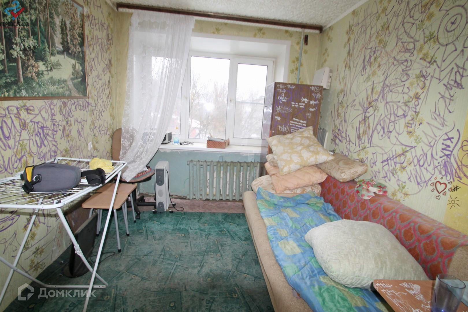 Комната располагается на четвертом этаже пятиэтажного кирпичного дома ( общежитие) , чистый подъезд, большая придомовая территория, много места для парковки автомобиля.