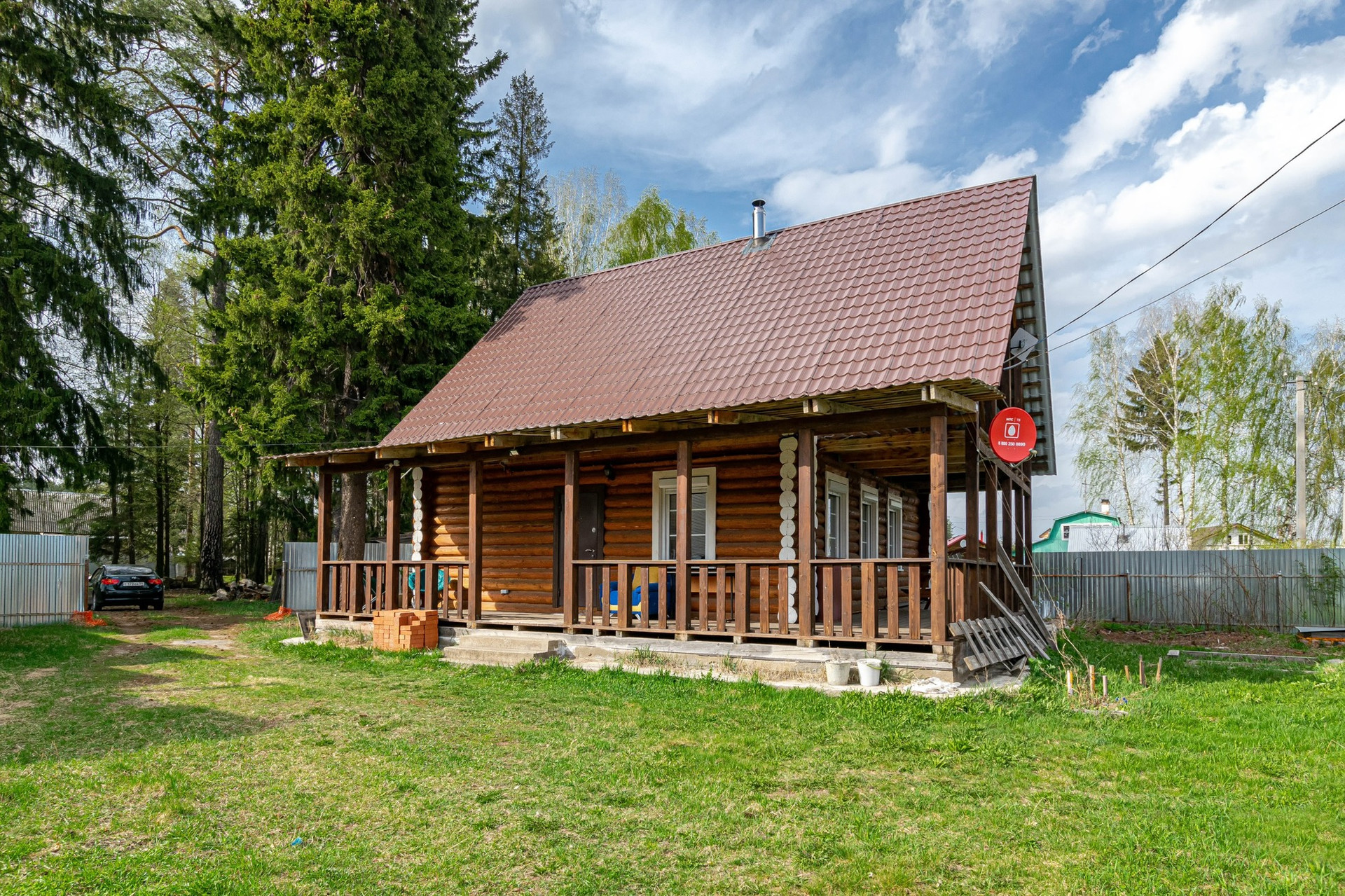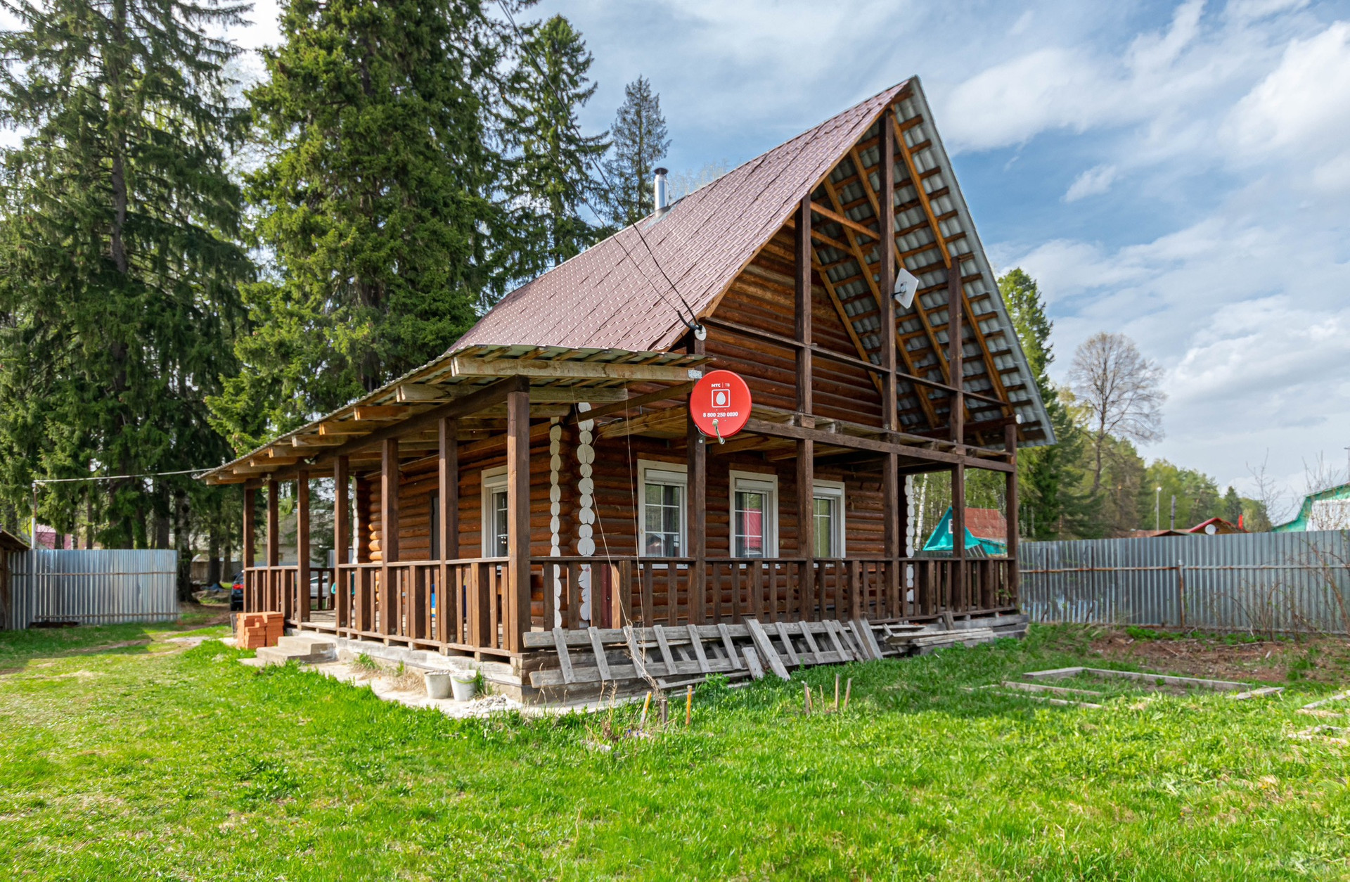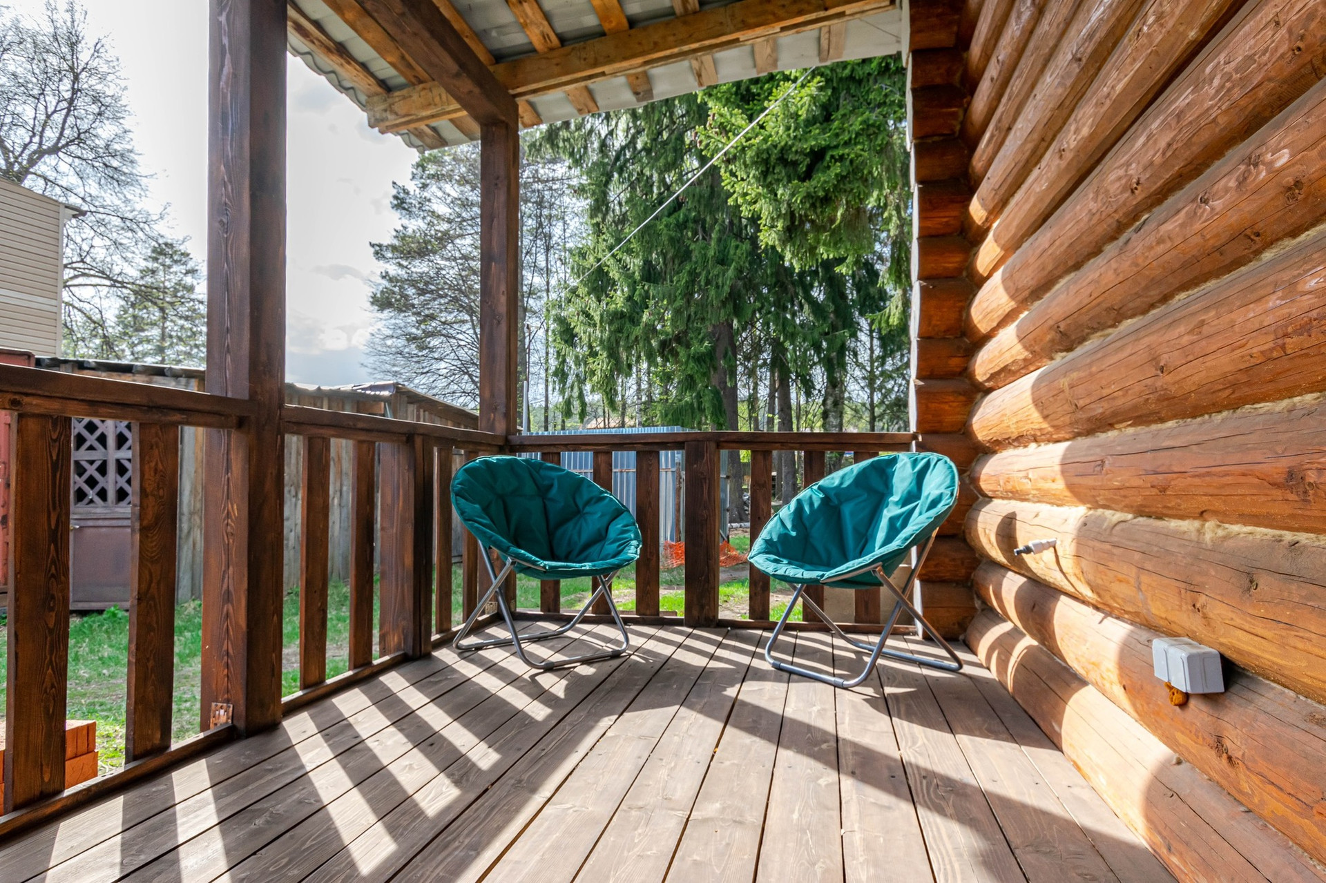 Теплый, уютный дом из бревна с большой террасой.