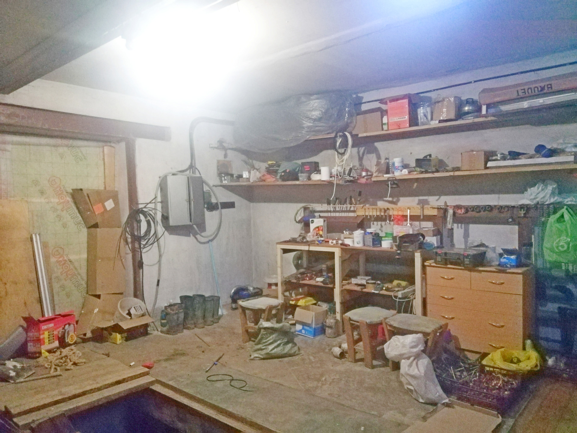 Бетонированный подвал высотой 2,5 м. Верхний слой кровли – толстое железо.