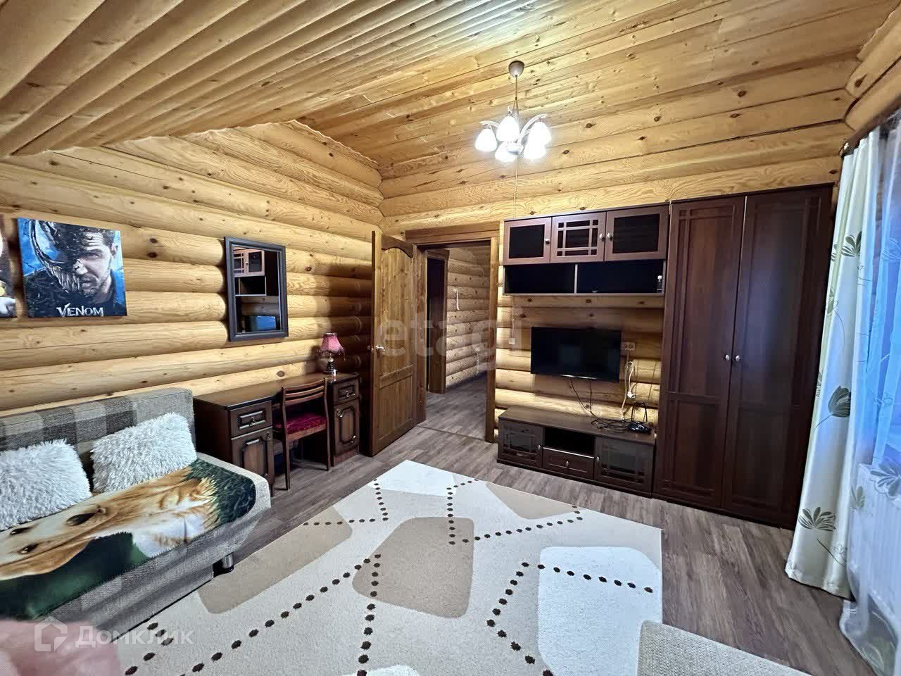 В доме на первом этаже большой тамбур с остеклением во всю высоту, на полу уложена плитка с подогревом. Далее входная группа с лестницей на второй этаж и большая гостиная совмещенная с кухней, котельная и санузел. На втором этаже расположены три спальни. Внутренняя отделка с сохранением текстуры дерева, пропитка по дереву. Продается со всей мебелью.