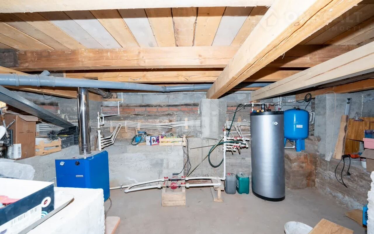 Лестница выполнена из натурального дерева, а окна оснащены трехкамерными стеклопакетами, что создает уютную атмосферу и защищает от уличного шума. Отопление осуществляется газом, а водоснабжение обеспечивается с глубины 21 м с помощью кессона и насоса GRUNDFОS. В доме установлен бойлер ВАХI на 150 литров и котел марки Ресhkin мощностью 31,5 кВт. Канализация представлена септиком Топаз с двумя колодцами для отвода очищенной воды.