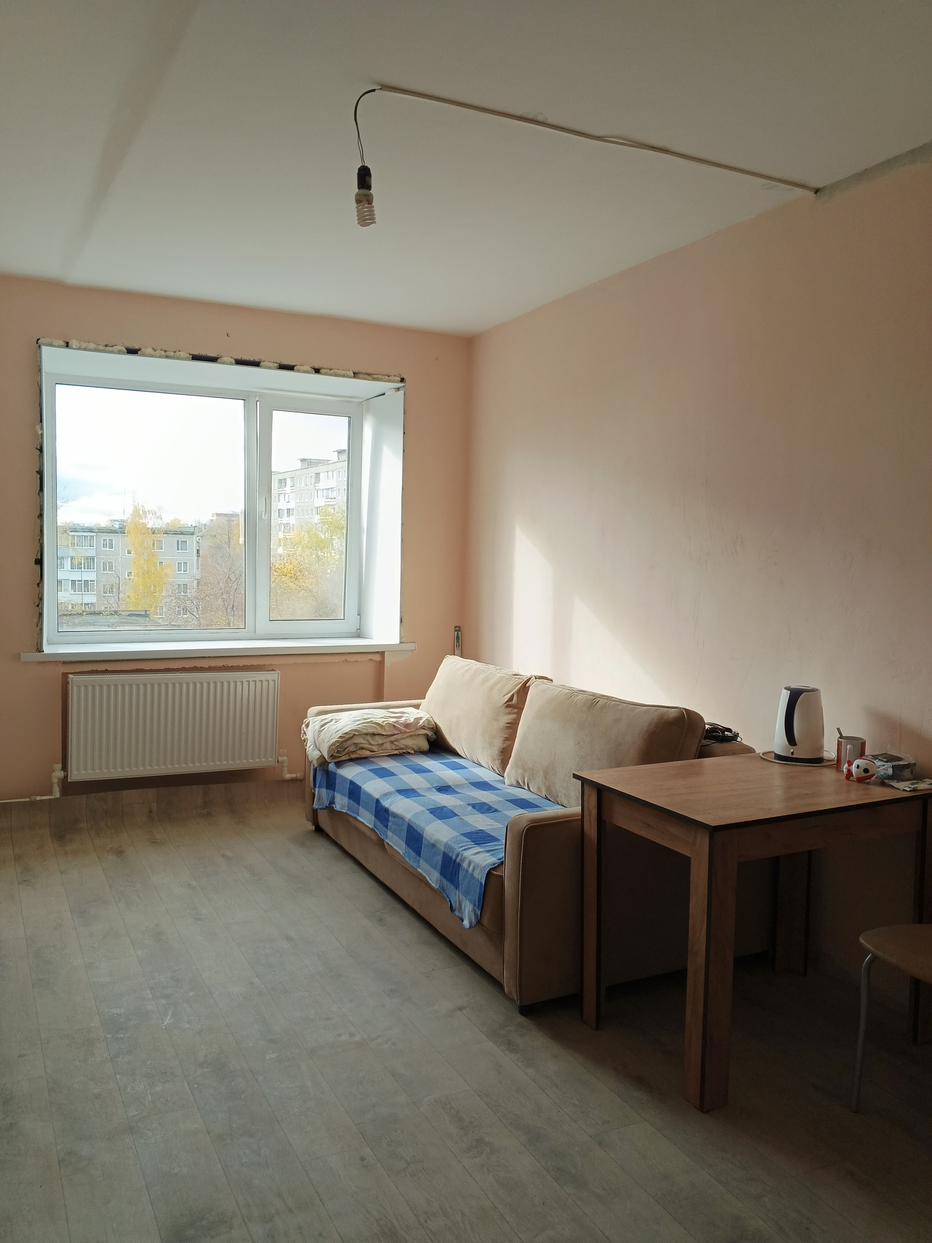На окно установлен стекло пакет, хорошие соседи. В комнату заведена вода.