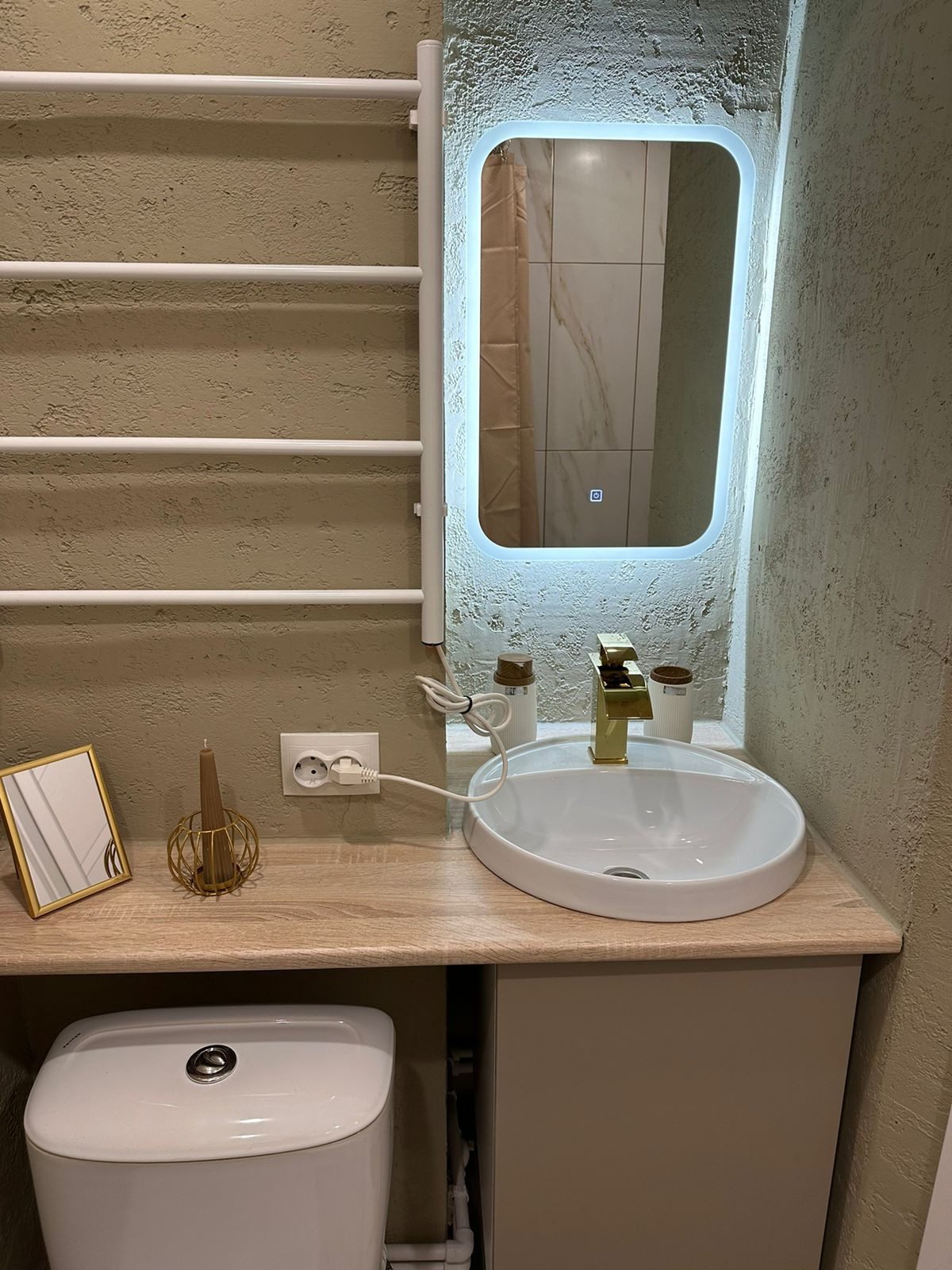 В санузле предусмотрено место для стиральной машины с выходами воды и канализации, электрический полотенцесушитель.