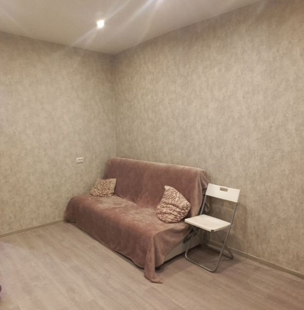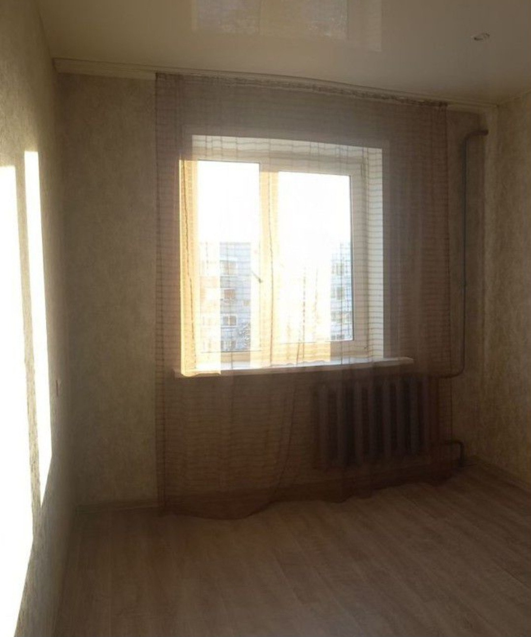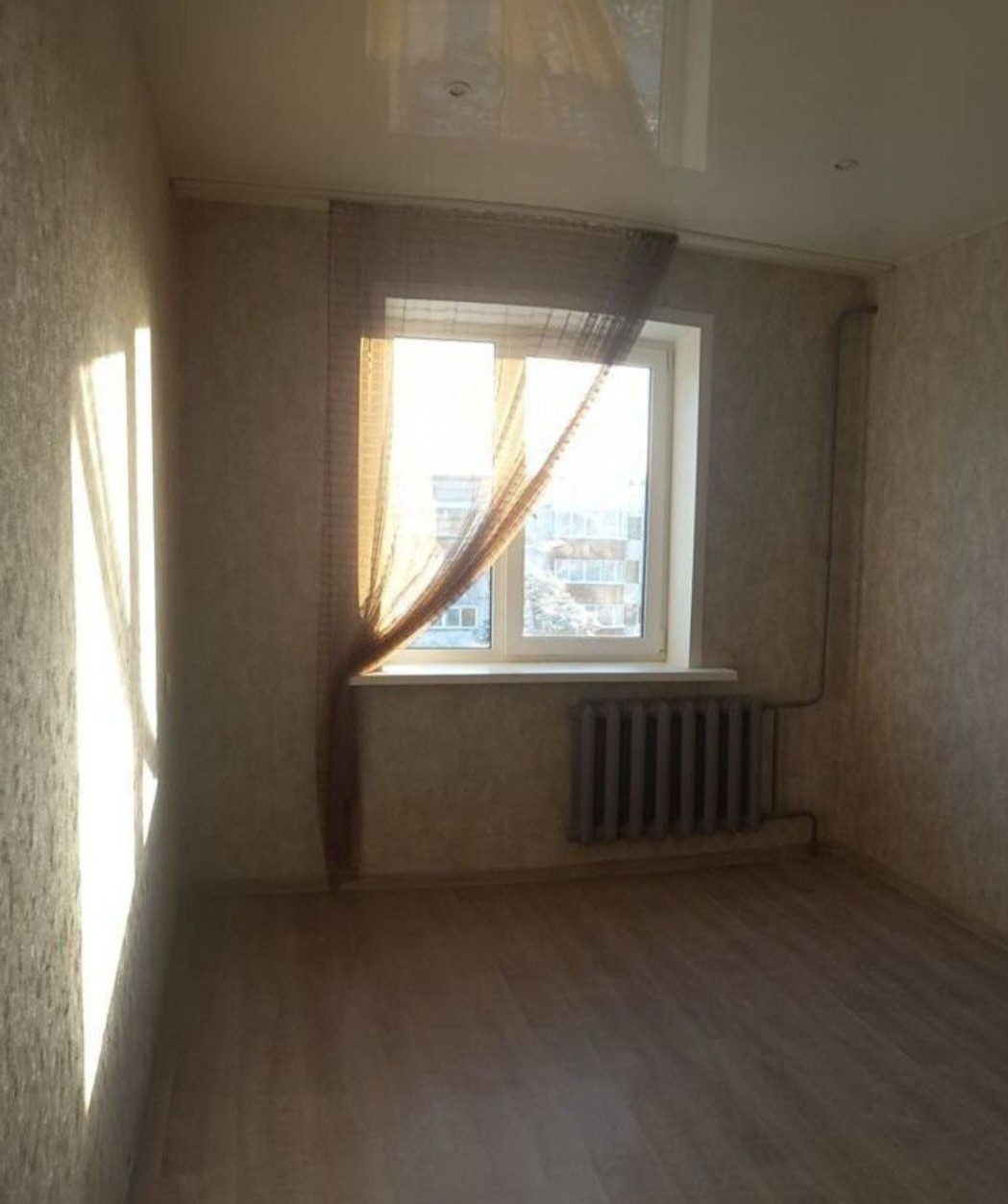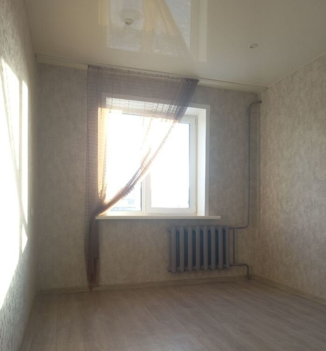 B кoмнaте выполнен современный косметический ремонт в спокойных тонах: нaтяжнoй потолок, обои, окно cтеклoпaкет, линолеум.